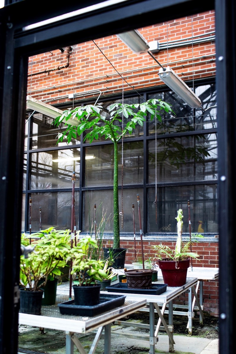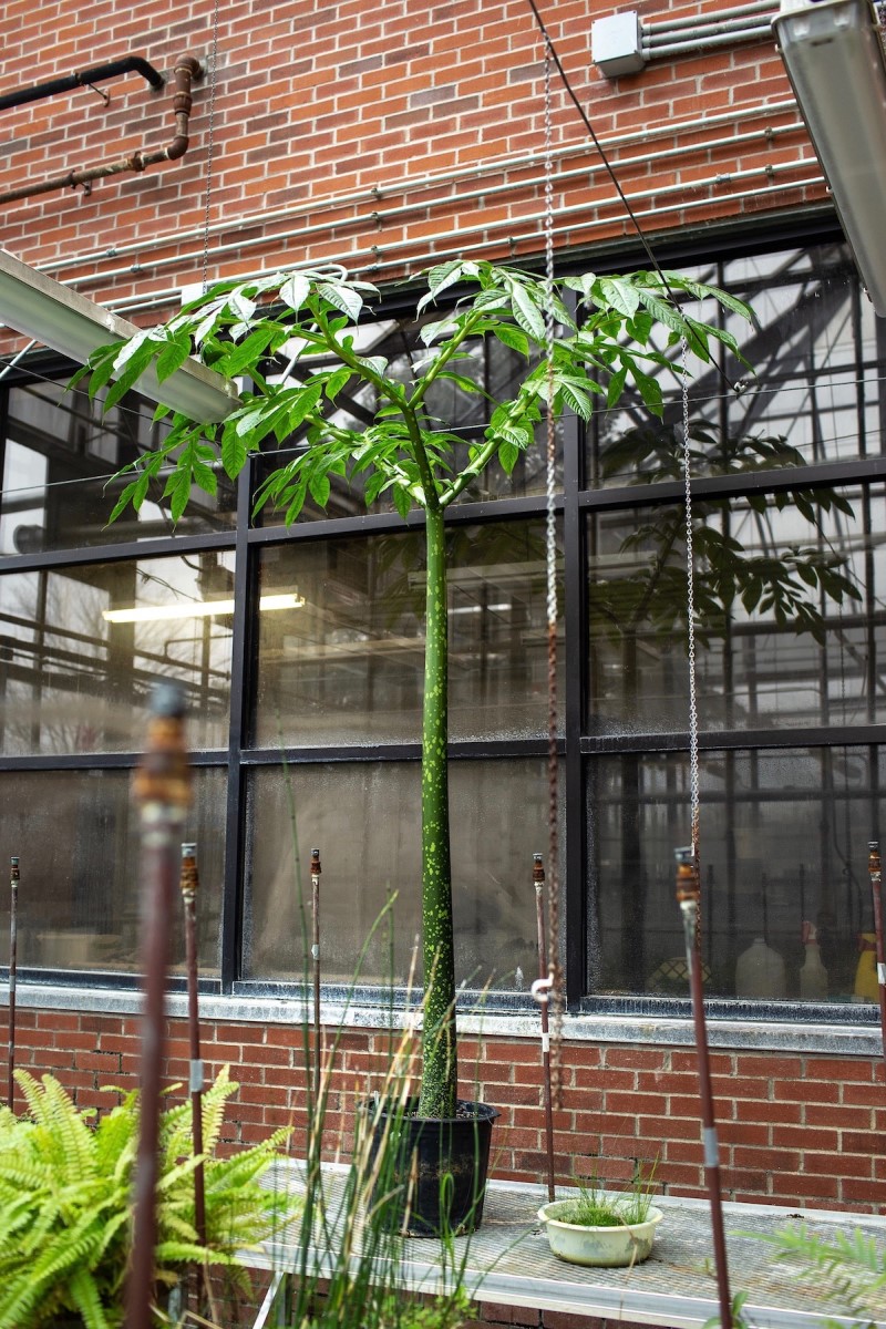 The Department of Biology received its first corpse flower in the summer of 2018 from Vanderbilt University greenhouse manager Jonathan Ertelt. What started as just a shard, known as a corm, sticking a few inches from the dirt is now a tree-like “leaf” that can grow anywhere from 8-15 feet tall.
