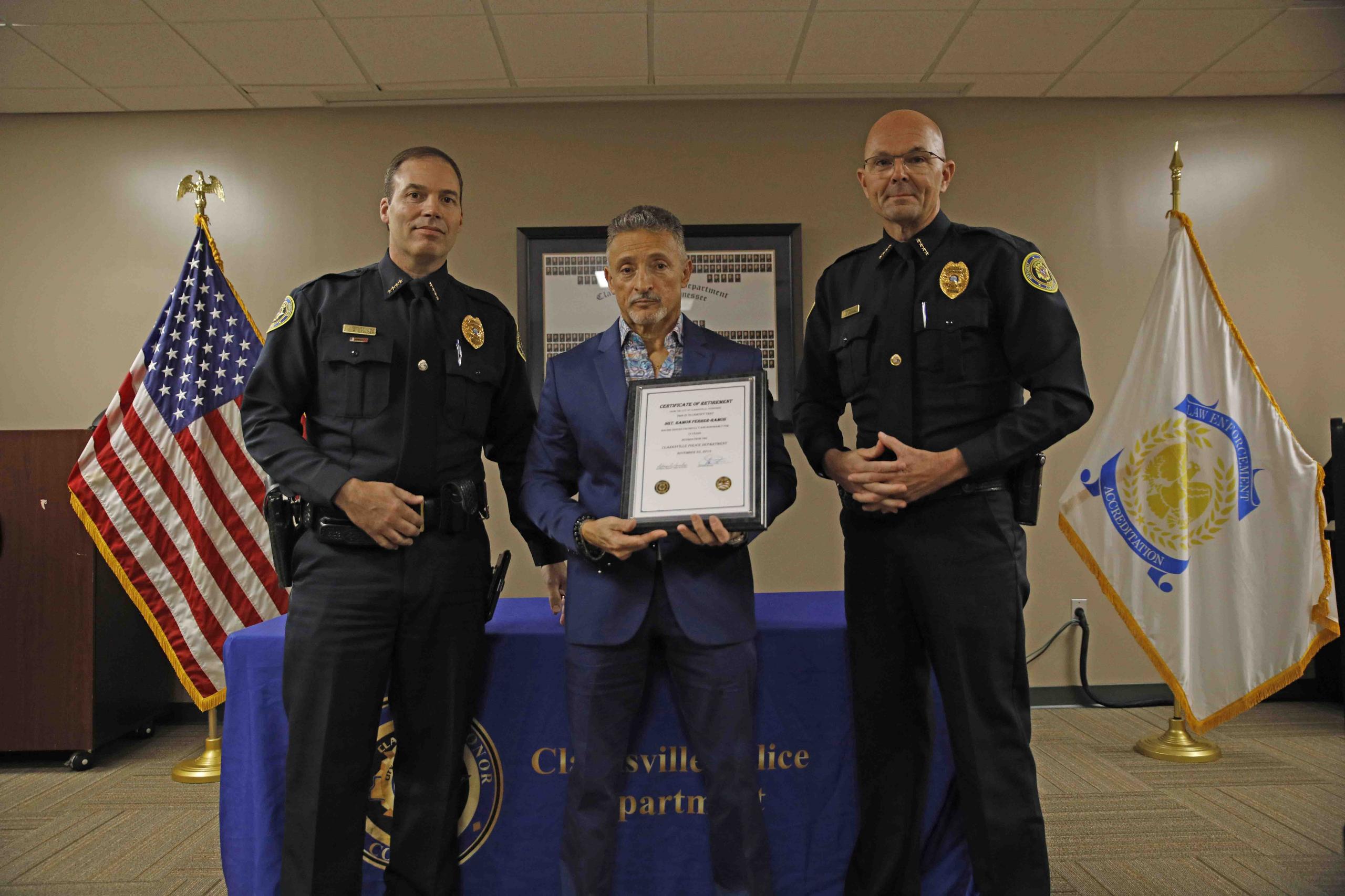 Clarksville Police Deputy Chief Crockarell and Deputy Chief Stalder officiated over the ceremony and presented a Certificate of Retirement to Sgt. Ferrer-Ramos, who served the department for 18 years. His retirement is effective today.