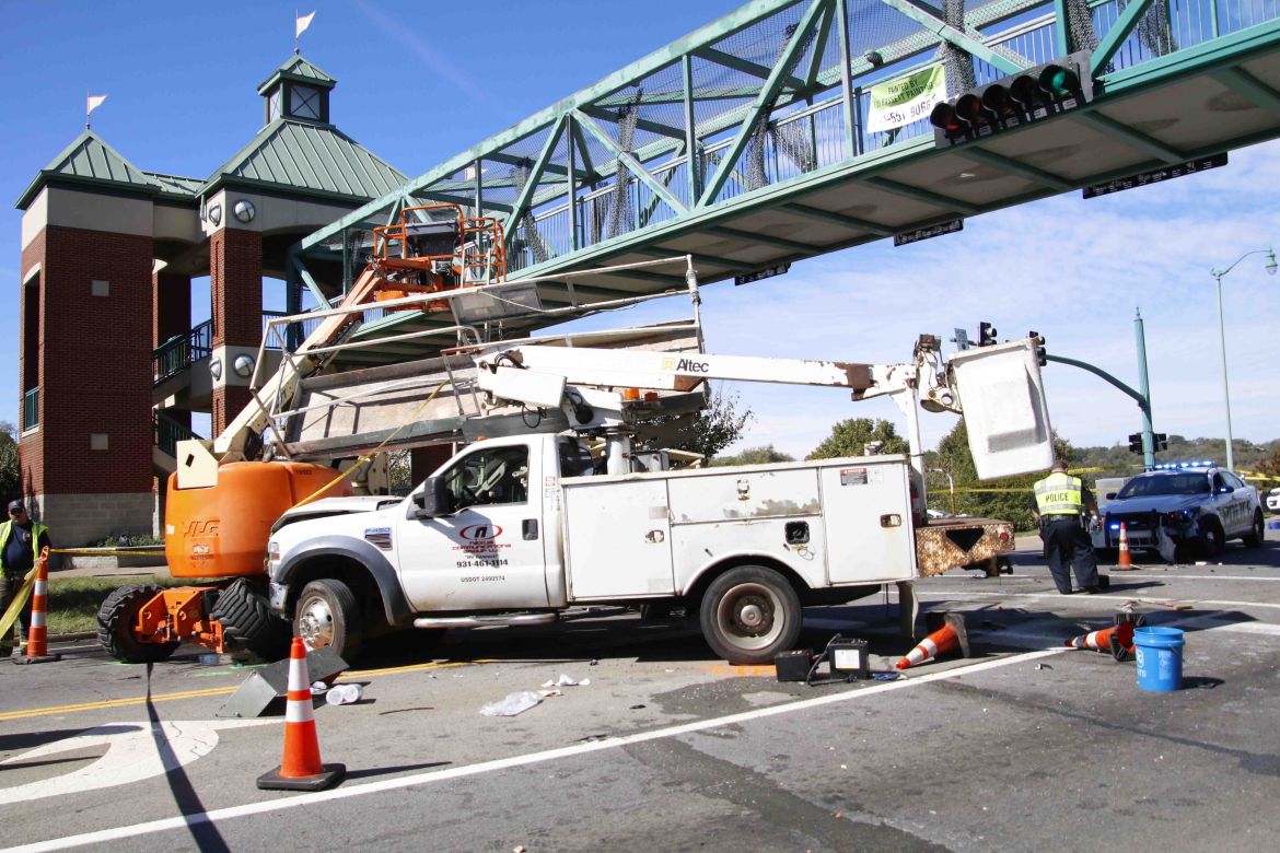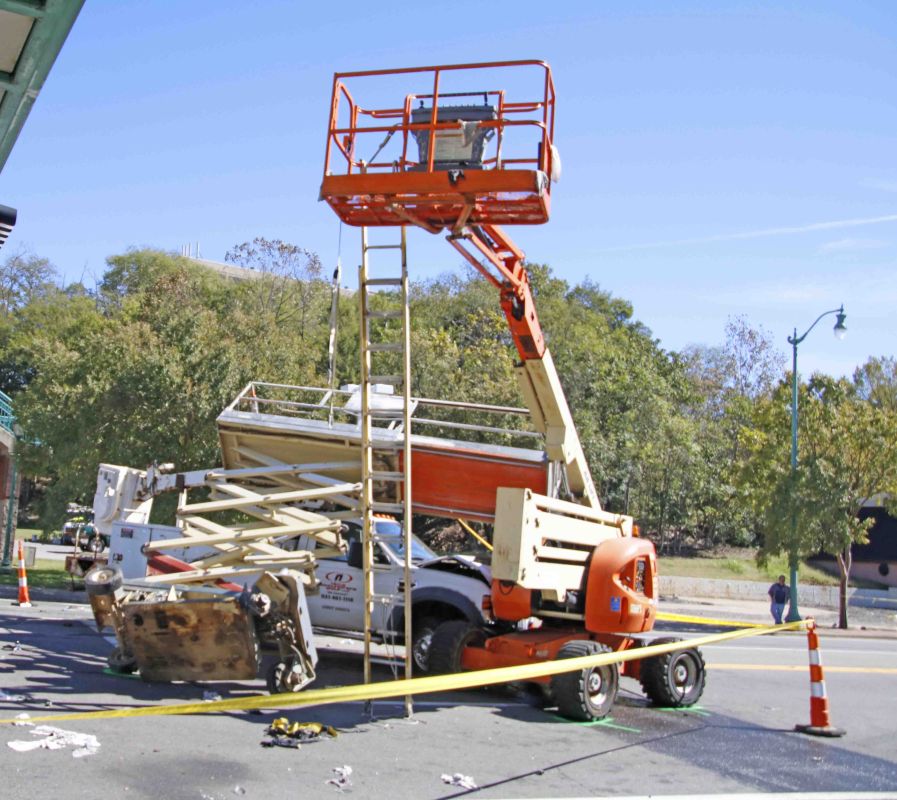 An F-450 truck driven by a 31-year-old man was traveling south on Riverside Drive through a work area and, for an unknown reason, did not stay in the path of the work zone and crashed into a patrol car, continued onward, hit two work lifts with two men on each one, and came to rest.