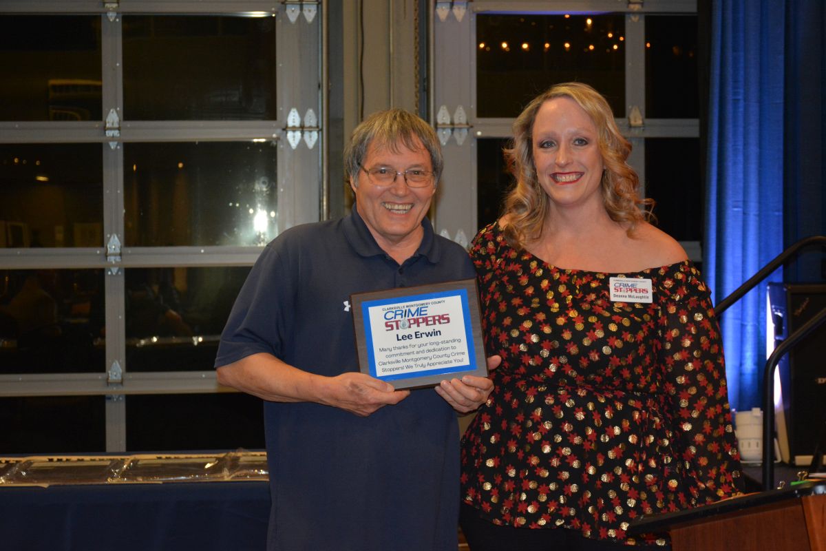 Lee Erwin of Clarksville Now accepts an award from Deanna McLaughlin at the Clarksville-Montgomery County Crime Stoppers Blue Jean Ball, on Feb. 11, 2022. (Lee Erwin).