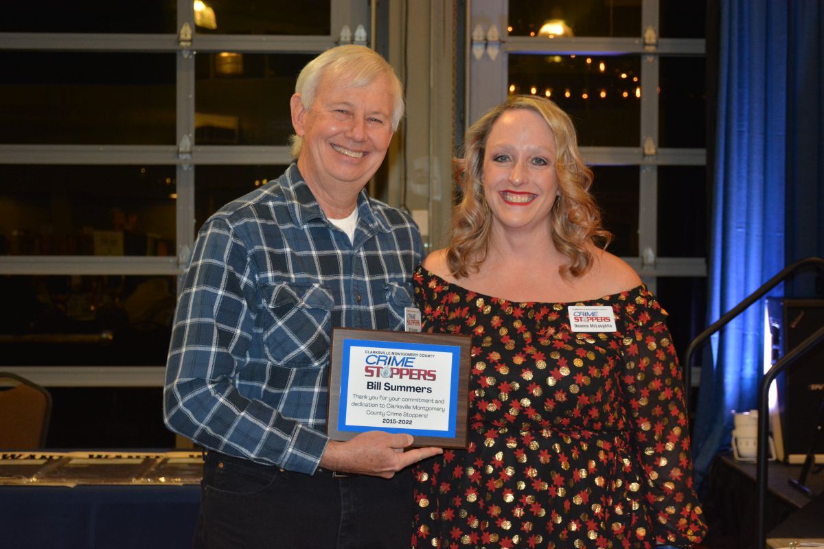 Bill Summers accepts a plaque from Deanna McLaughlin at the Clarksville-Montgomery County Crime Stoppers Blue Jean Ball, on Feb. 11, 2022. (Lee Erwin)