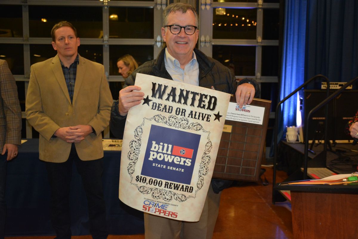 State Sen. Bill Powers and other Clarksville-Montgomery County Crime Stoppers Blue Jean Ball sponsors are recognized for their support of the event ,on Feb. 11, 2022. (Lee Erwin)