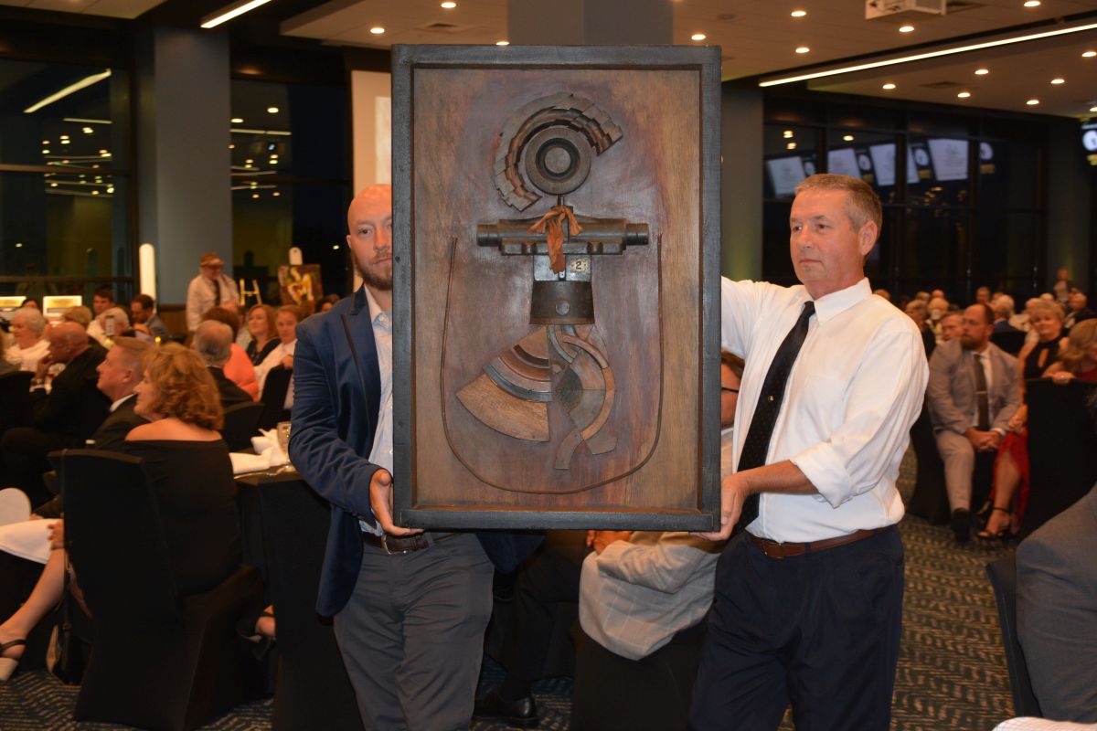 The Signature Artist painting “Peg’s Pony, by artist Kitty Harvill, at the Customs House Museum & Cultural Center’s 38th Annual Flying High with a secret agent 007 James Bond theme titled Live and Let Fly was held at Oak Grove Racing, Gaming and Hotel on July 16, 2022. (Lee Erwin)