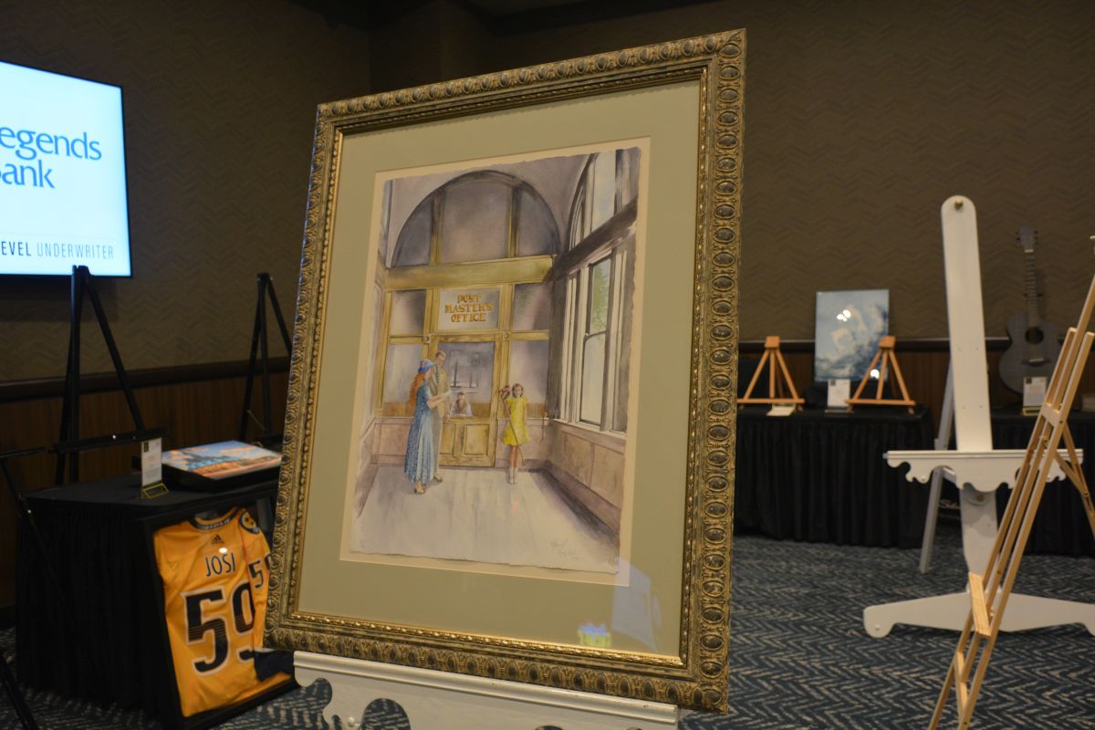 The painting, “Peg’s Pony,” represents the Postmaster’s Office of the Clarksville U.S. Post Office and Customs House, built in 1898, and was inspired by a black-and-white photograph from the museum’s archives. Kitty Harvill’s mother, Peg Harvill, was a Flying High Signature Artist a dozen times, including for the gala’s first 10 years.
