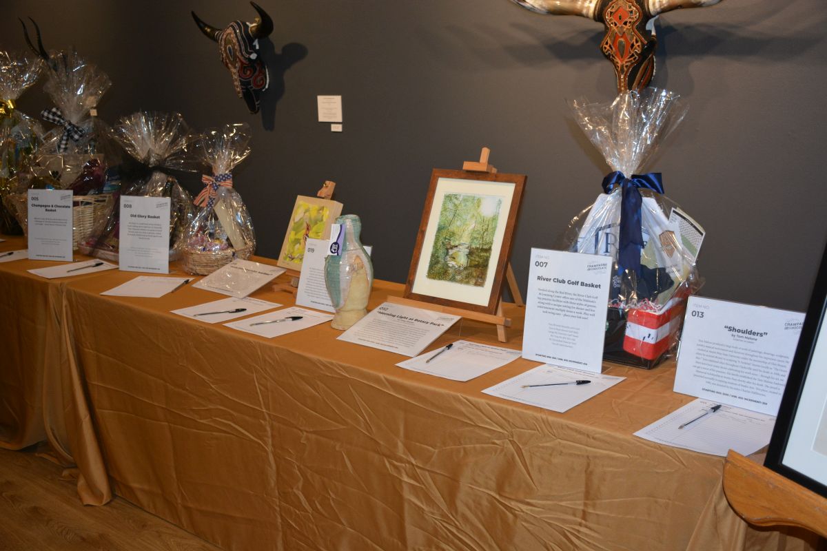 A few of the many silent auction items at the Customs House Museum & Cultural Center Champagne & Chocolate fundraiser on Feb. 3, 2023. (Lee Erwin)