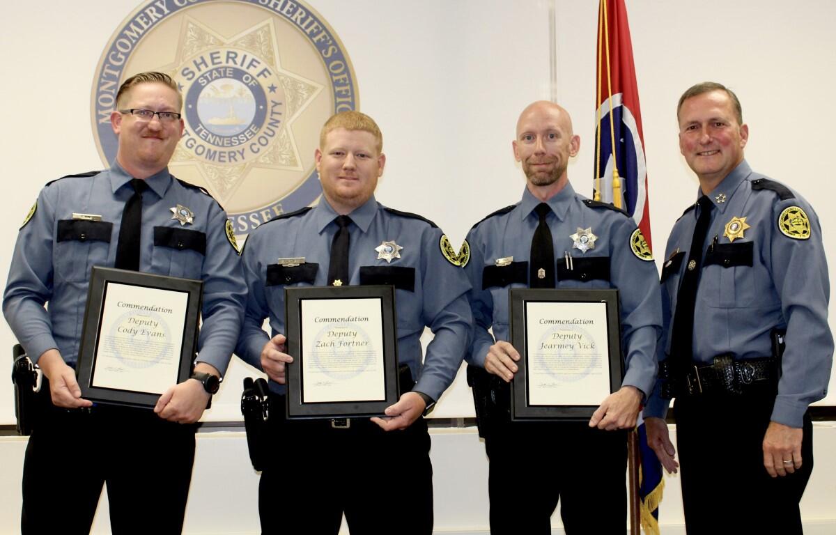 CLARKSVILLE, TN – On June 16, Montgomery County Sheriff John Fuson conducted a ceremony to recognize and honor Deputy Zach Fortner, Deputy Cody Evans, and Deputy Jearmey Vick. Each of these deputies were presented a commendation, the highest recognition and award MCSO can bestow on an individual.