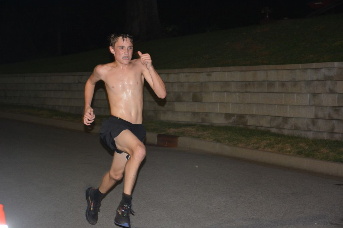 Koen Ploeckelman is the first runner to cross the finish line at the 7th Annual “Deputy Bubba Johnson Memorial Road Race” with the Montgomery County Sheriff’s Office on Saturday, August 28 2021 (Lee Erwin).