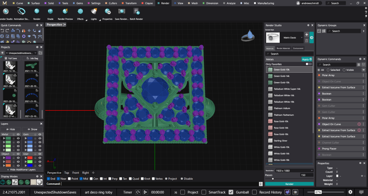 If designing an engagement ring, Andrew starts with the center stone and the ring size, and then he designs from there. He can alter the CAD drawing to change the shape and size of the stone in the drawing. A rendering is then created and sent to the client for approval.