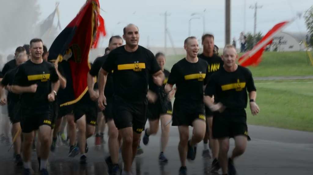 Family members lined the streets and cheered the soldiers as they passed by. Helicopters flew overhead throughout the run, cannons fired for each unit as they ran by, and the Fort Campbell Fire Department provided a cooling effect with a continuous light spray of water at one point along the route.