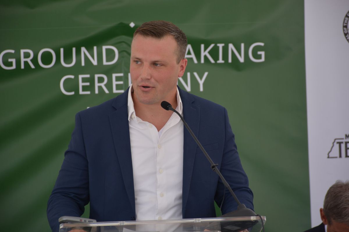 Josh Ward, vice president of Industrial Development for the Clarksville-Montgomery County Industrial Development Board, speaking the Dongwha Electrolyte groundbreaking ceremony on June 6, 2022. (Lee Erwin)
