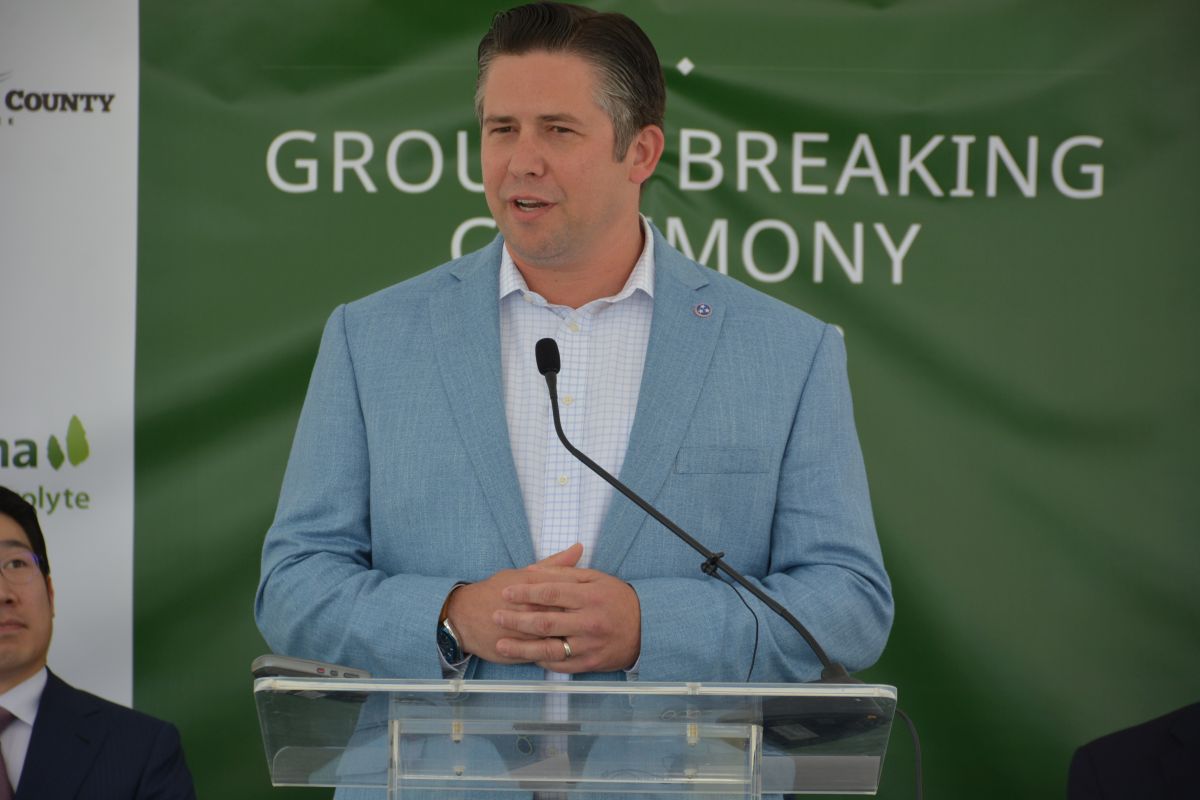 Tennessee Commissioner Stuart McWhorter speaking at the Dongwha Electrolyte groundbreaking ceremony on June 6, 2022. (Lee Erwin)
