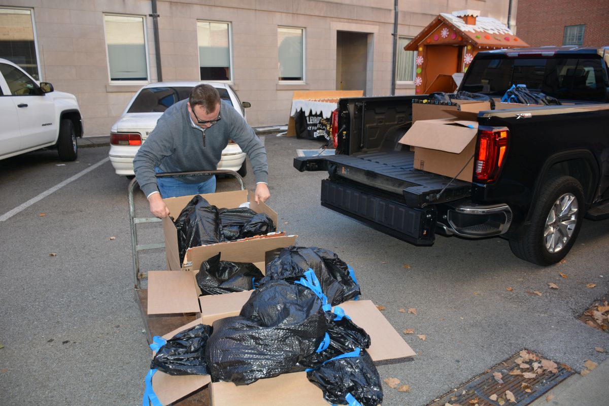 Kiwanis Club of Clarksville members load up bags of toys to be delivered to children in the Lafayette Head Start Program for Christmas, on Dec 7 2021. (Lee Erwin)