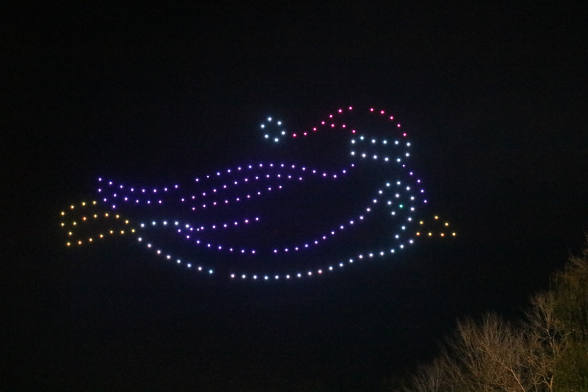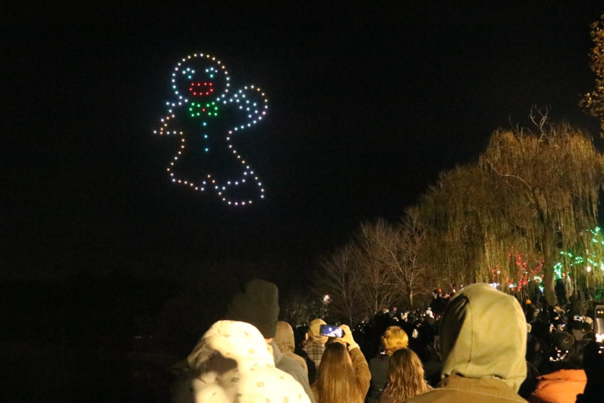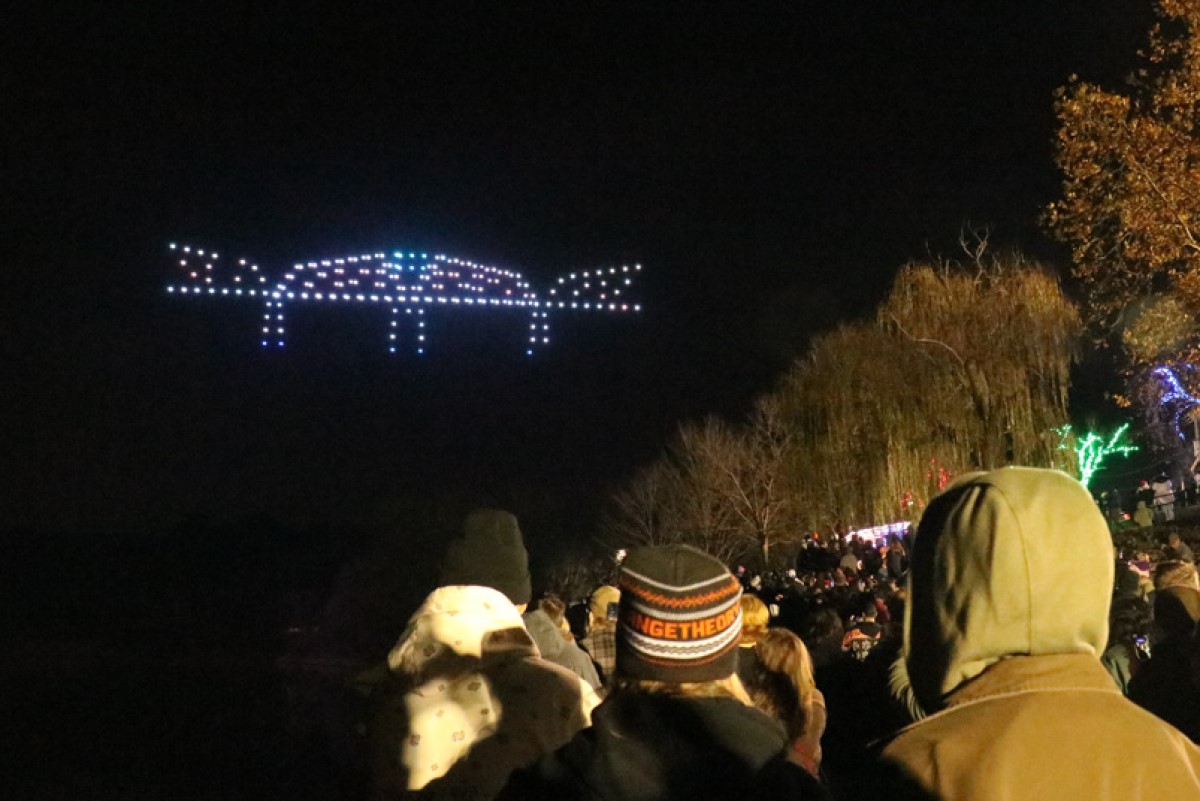 The display by Firefly Drone Shows consisted of 200 synchronized drones that formed holiday images in the night sky. The 15-minute show stretched 300 feet high and spanned 600 feet wide.