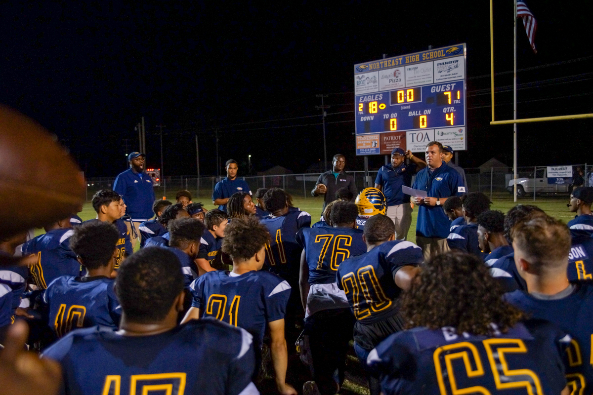 Northeast football coach Brandon Clark talked about Rumble’s effort and positioning on the play that led to the eventual 18-7 Eagle win on senior night.