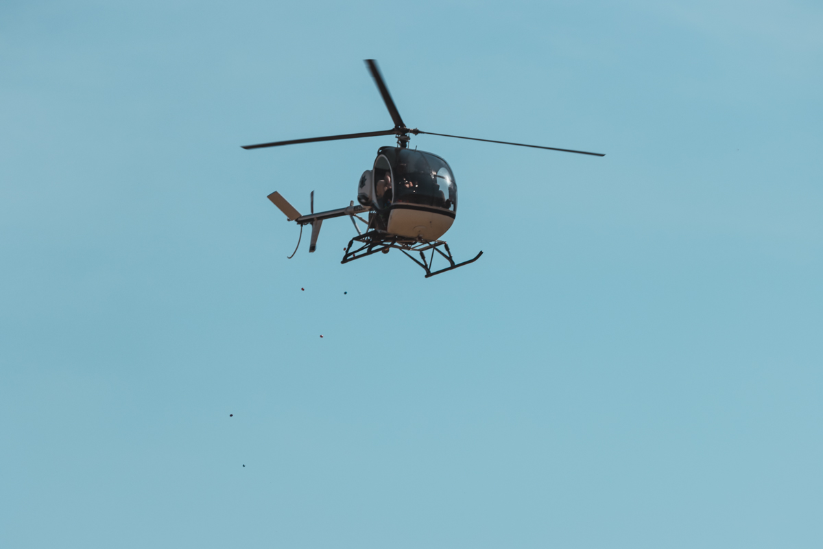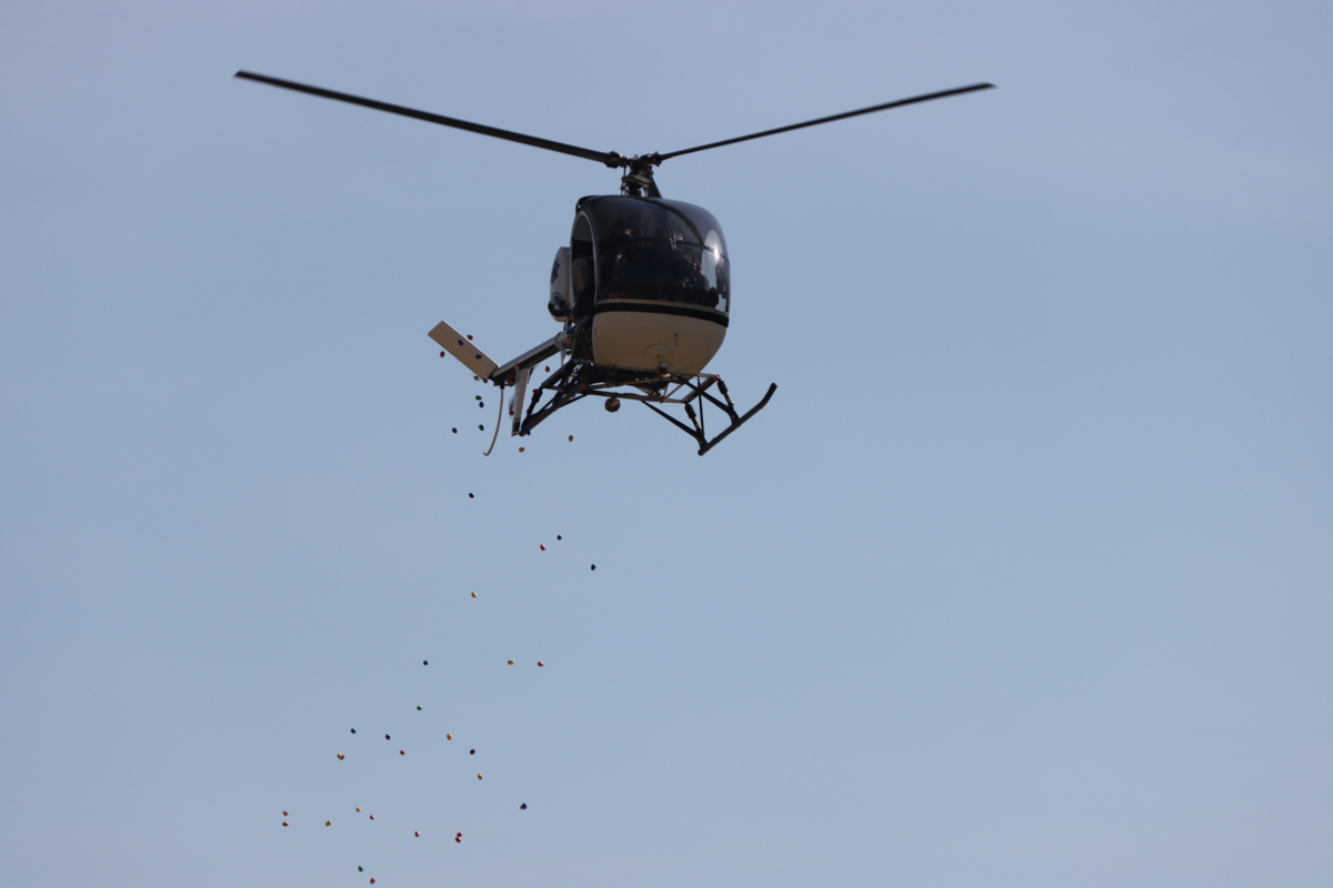 A helicopter delivered the eggs to dozens kids on the end of the golf course.