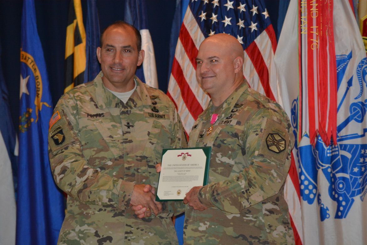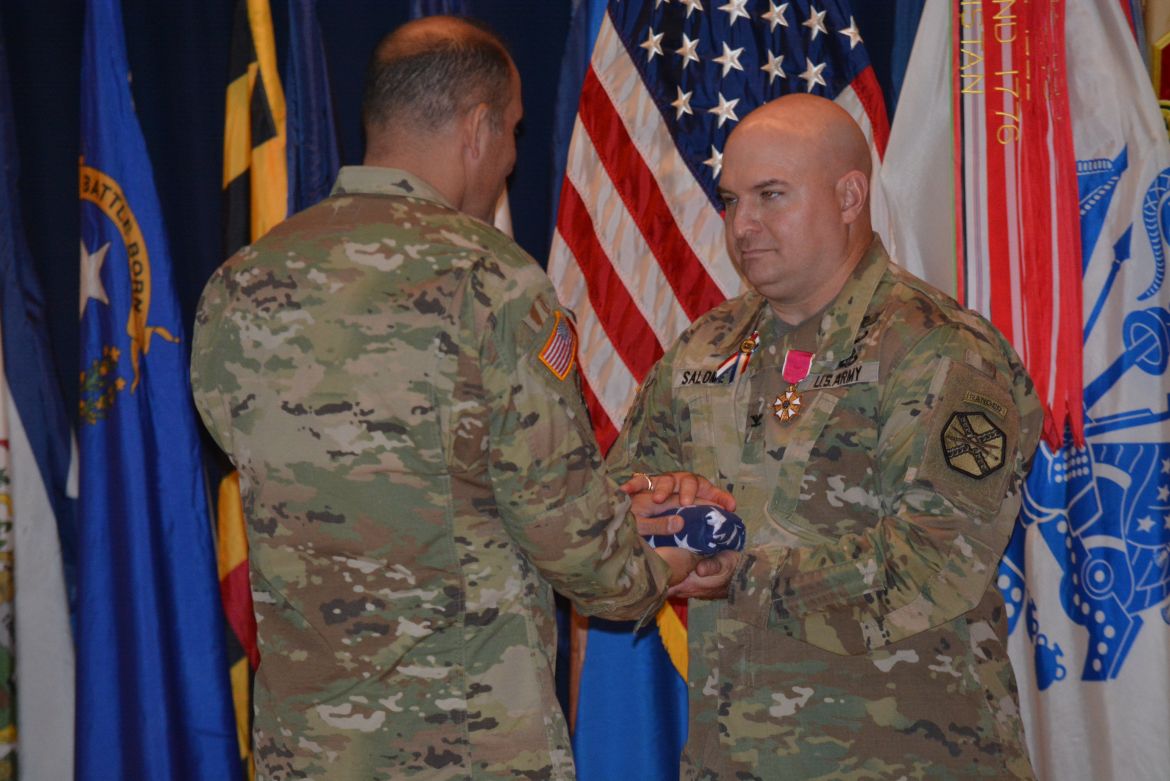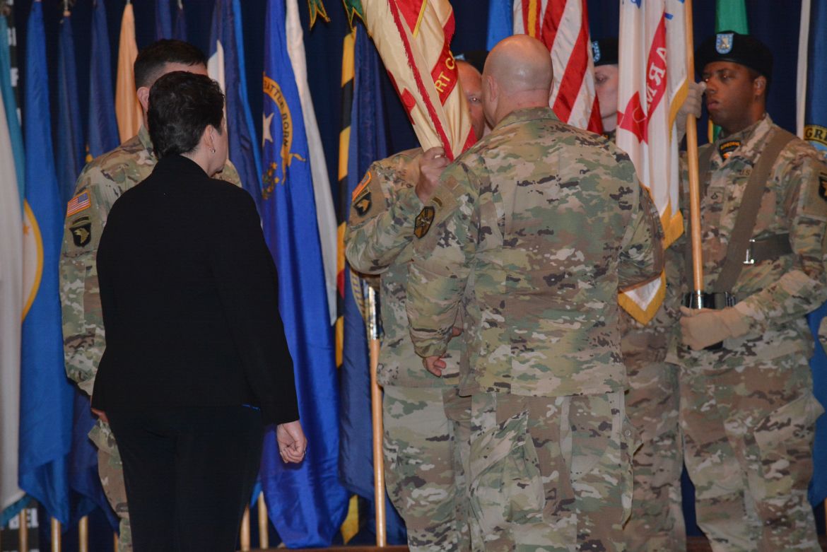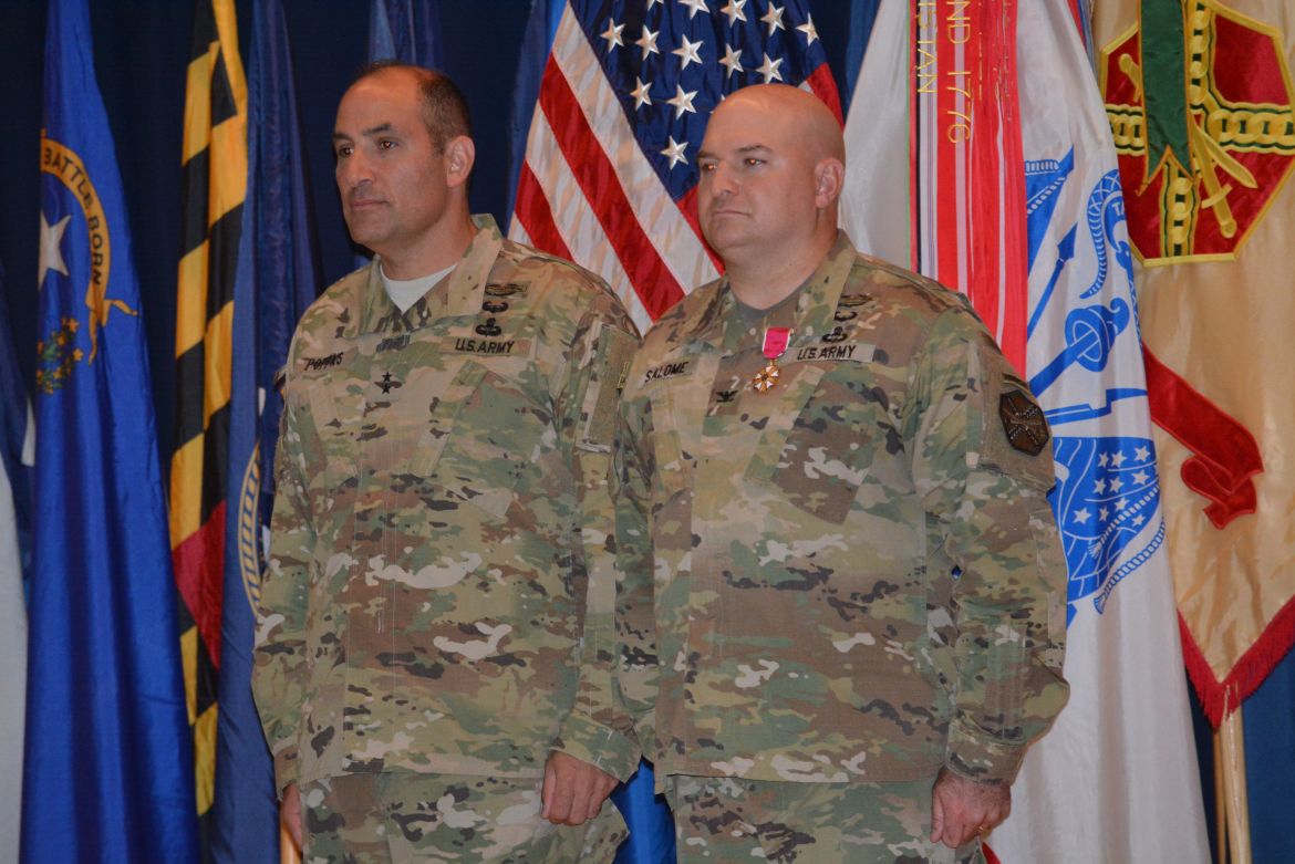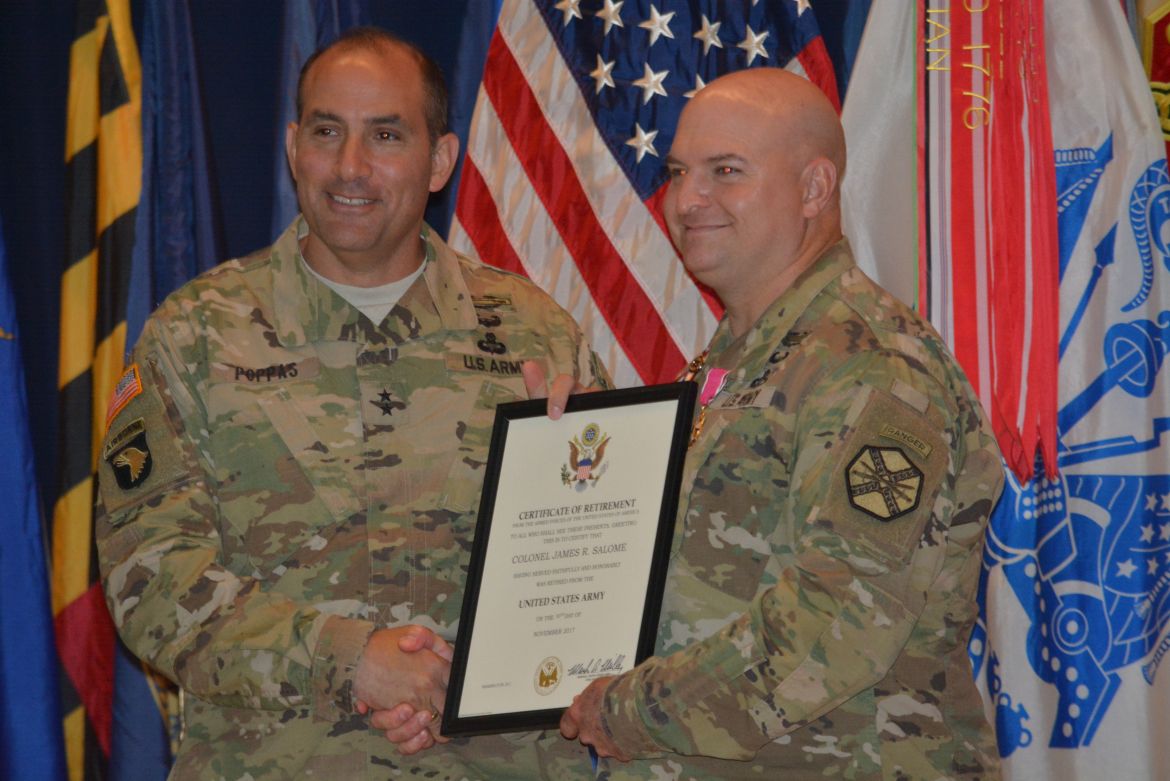 General Poppas presented Colonel Salome with the Legion of Merit and an American flag and for his dedicated service to the U.S. Army, along with a certificate of retirement. Colonel Salome’s wife Patricia was also presented with the Outstanding Civilian Service Medal and a certificate of appreciation for her support of her husband. Certificates were also presented to Colonel Salome’s two daughters, Marcella and Marianna, for their support of their father during his military career. Salome and his family will reside in the Fort Campbell area.