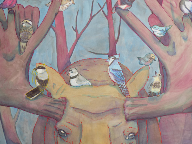 Male animal horns serve as the focal points in many of her pieces. These horns are richly adorned with tree branches or other flora whose surrealistic elements oftentimes take on the appearance of a new species.
