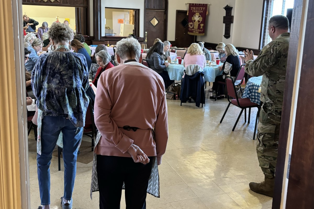 The Rev. Chad McCabe, right, offers a prayer at the Empty Bowls lunch at Trinity Episcopal Church on Feb. 20, 2024. (Erin Miskimins)