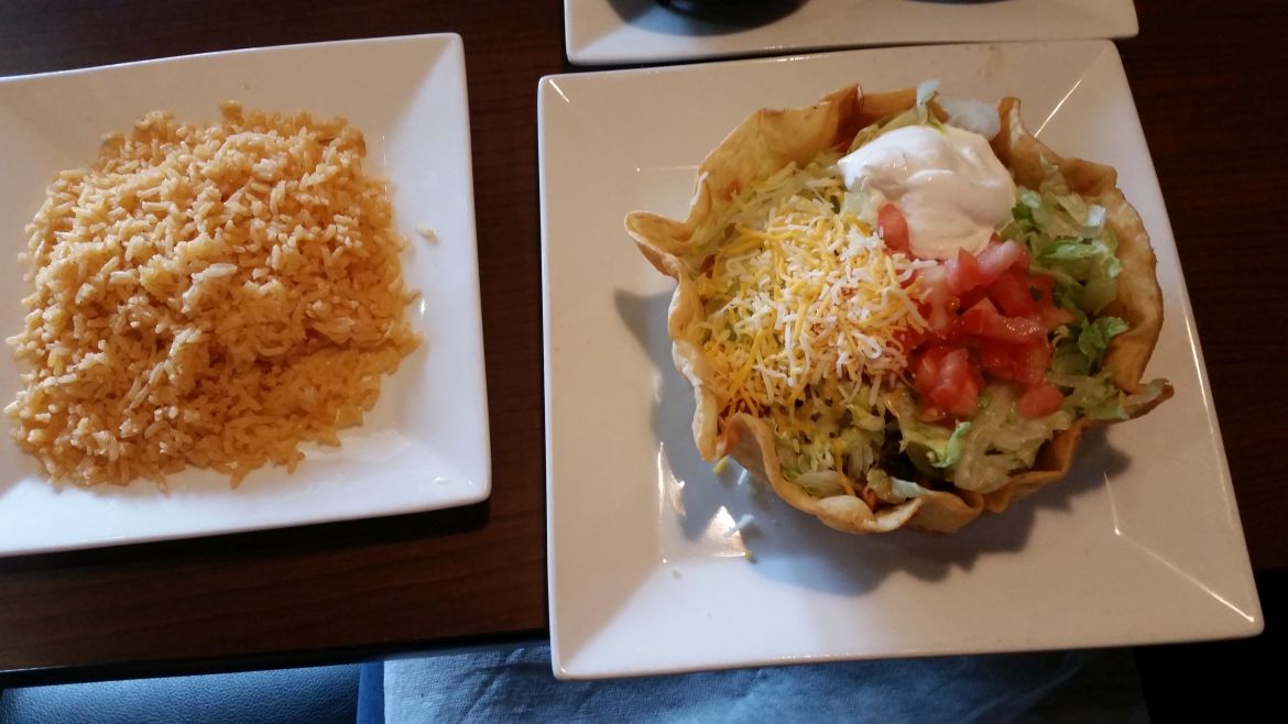 I almost always order a quesadilla fajita wherever I go, so I chose to branch out a little and ordered the lunch taco salad fajita ($7.59 – A crispy flour tortilla filled with grilled chicken, cooked with onion, green and red bell pepper, smothered with cheese sauce, topped with lettuce, tomato, and sour cream). The ‘smothered with cheese sauce’ bit really hooked me.