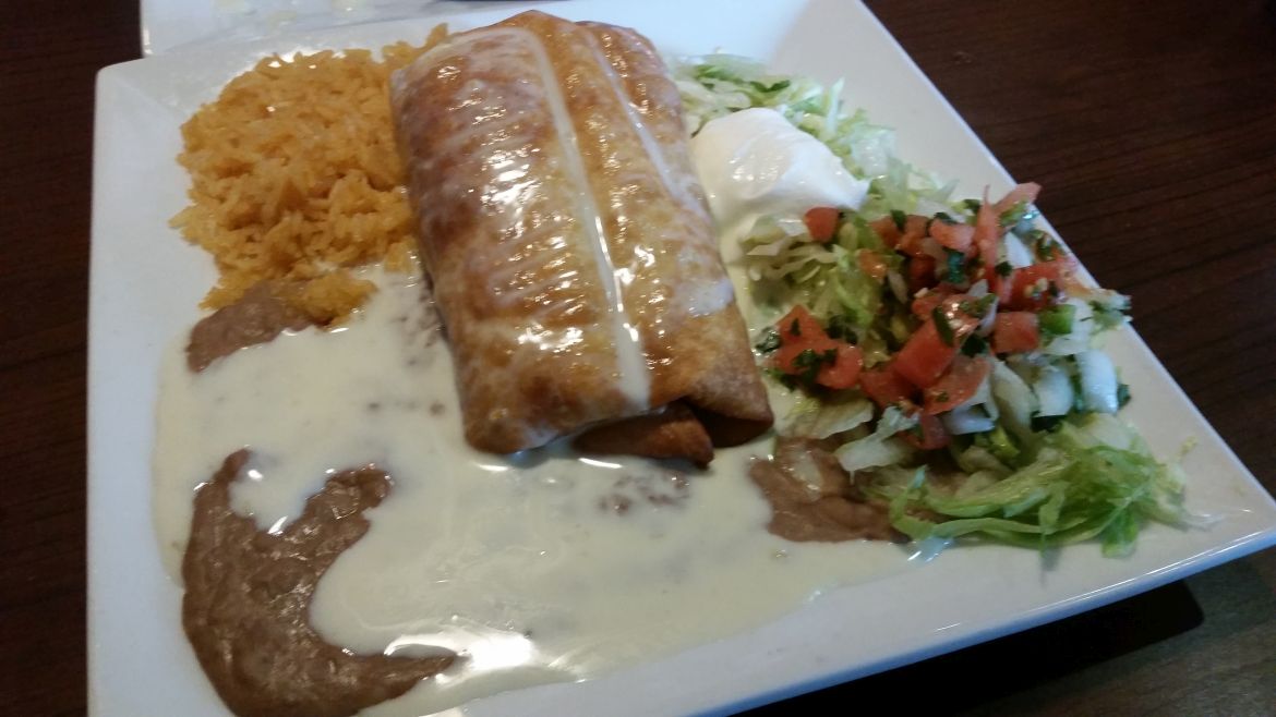Our server was attentive and helpful. He pointed out the lunch menu, which offers great prices for a decent amount of food. My coworker ordered the lunch chimichanga (7.99 – Flour tortilla stuffed with beef tips or shredded chicken and then deep-fried to a golden brown. Smothered with cheese sauce and served with rice, beans, lettuce, sour cream, and pico de gallo).
