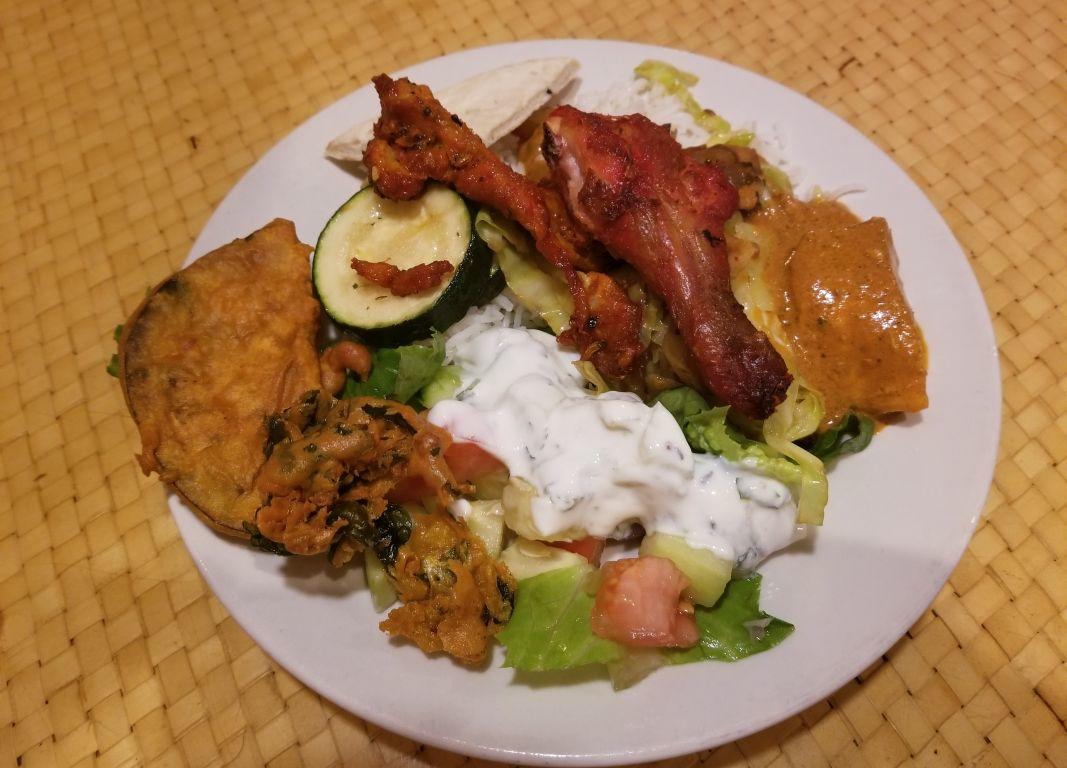 The day we visited, the buffet included Chicken 65, Chicken Pasanda, Grilled Zucchini, Fried Spinach, Fried Eggplant Pakora, Cabbage Salad, Tandoori Chicken, Vegetable Biryani, Basmati Rice, Naan, Lentil Soup, Hummus, Navratan Korma, and salad with various dressings.
