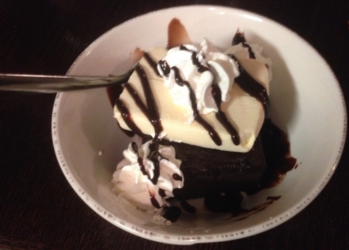 My dining partner ordered the jumbo shrimp with onions rings and was equally pleased and unlike me saved room for the Fudgie Wudgie Chocolate Cake. Rich, moist cake with fudge and whipped cream topping. Happily, this was large enough to split and was a fabulous way to finish.