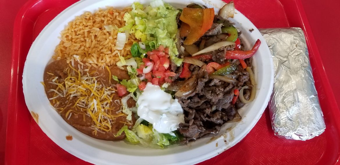 I ordered the steak fajita, which came with lettuce, tomatoes, sour cream, and guacamole. The plate was filled with meat, onions, bell peppers, rice, and beans. The portions seemed a little bit off, but the meal was cooked well and fresh. My favorite part of the meal was the guacamole and chips.
