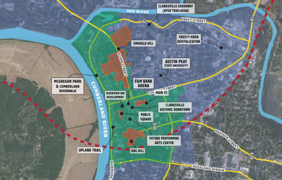 Businesses and property from Riverside Drive at Providence Boulevard to near Crossland Avenue, in the Main Street, Public Square, Dog Hill areas and portions of the Emerald Hill areas make up the CBID and are shown on the online CBID map.