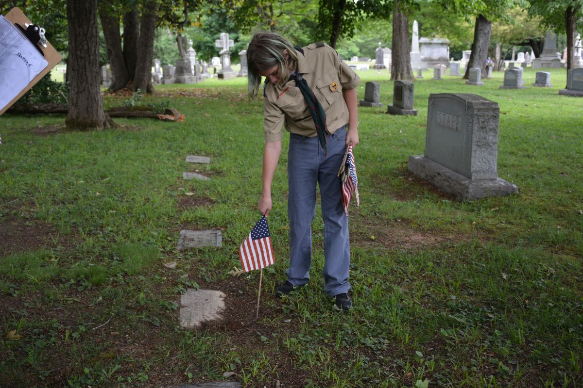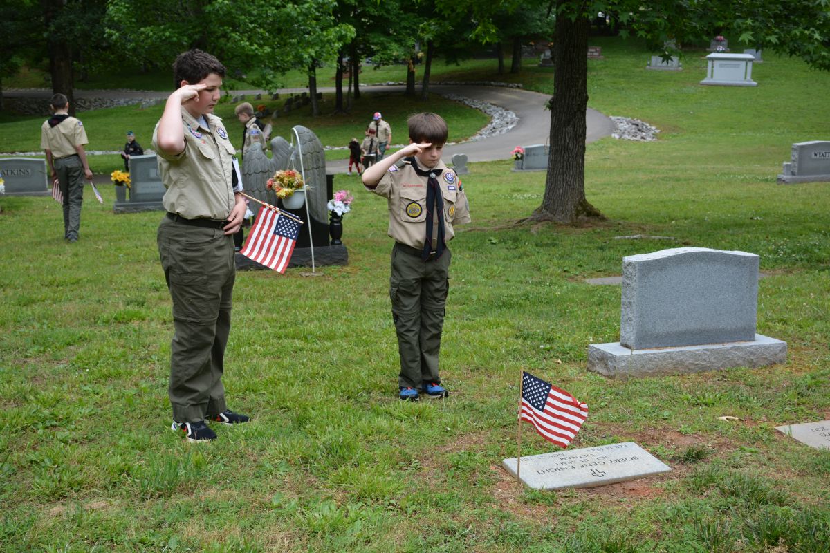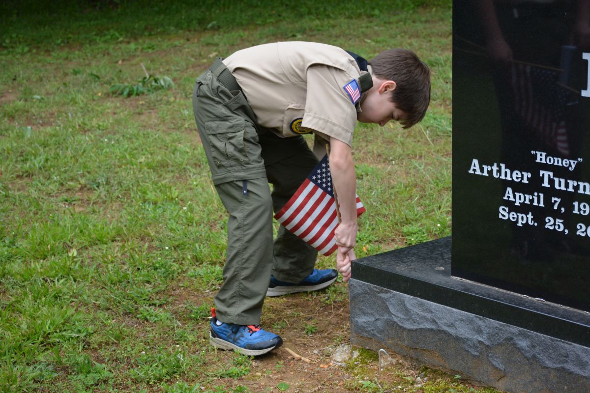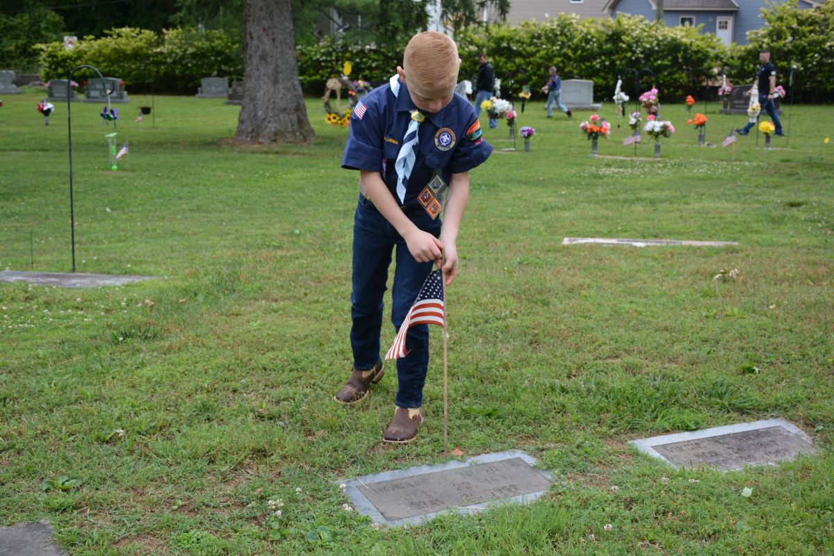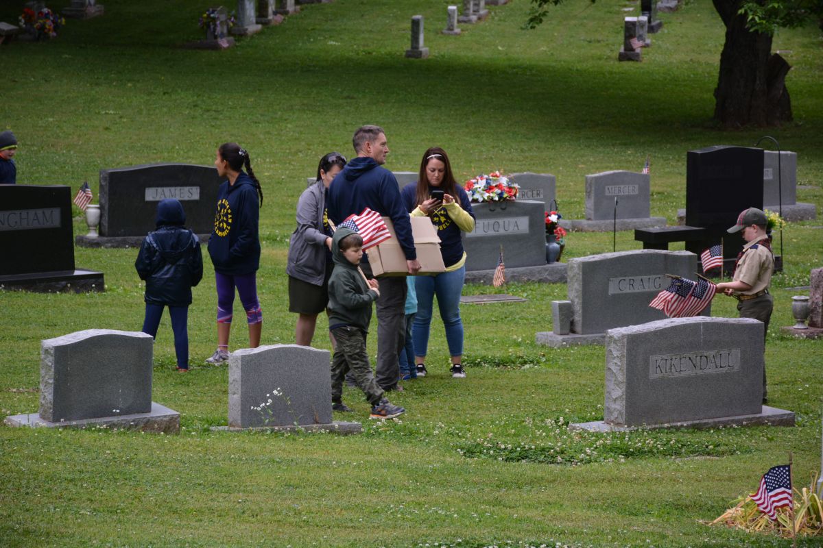 After a brief ceremony with the playing of taps, and the U.S. flag being lowered to half-staff, at the Veterans Memorial at Greenwood Cemetery, more than 100 scouts from the Cogioba District, supported by family and friends, placed hundreds of flags on veteran’s gravesites at the cemetery on Saturday, May 29.