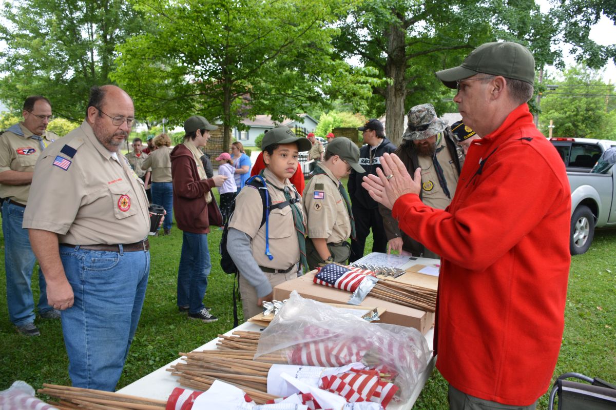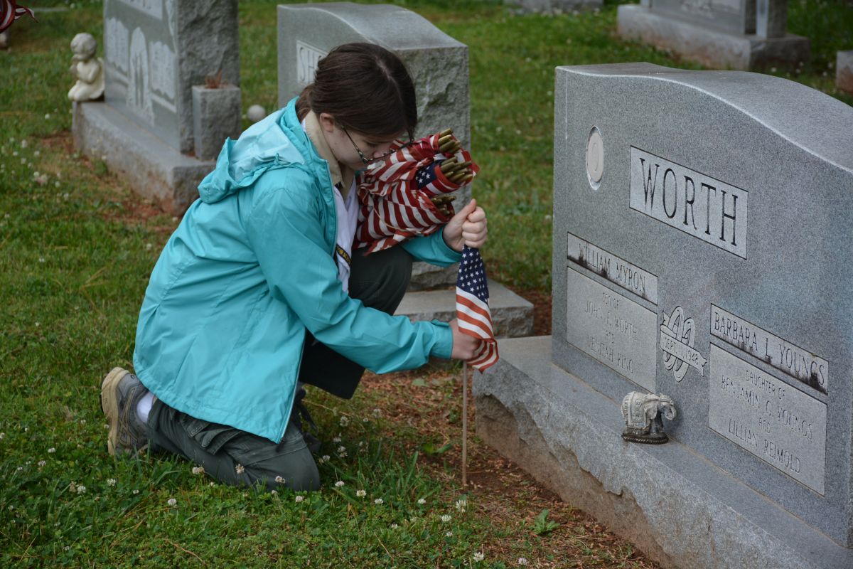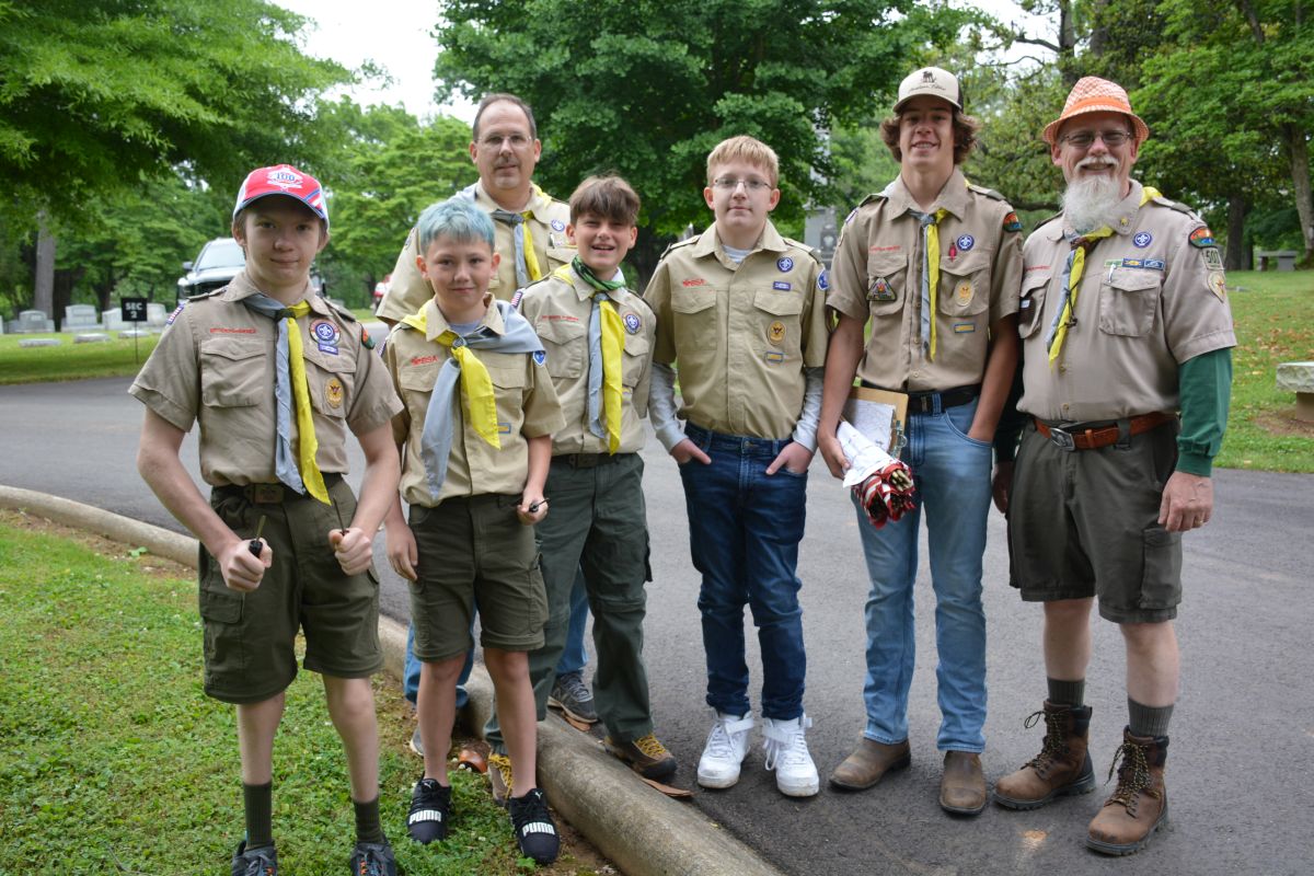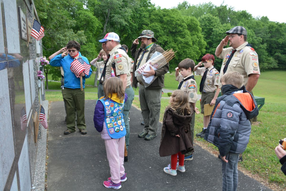 After a brief ceremony with the playing of taps, and the U.S. flag being lowered to half-staff, at the Veterans Memorial at Greenwood Cemetery, more than 100 scouts from the Cogioba District, supported by family and friends, placed hundreds of flags on veteran’s gravesites at the cemetery on Saturday, May 29.