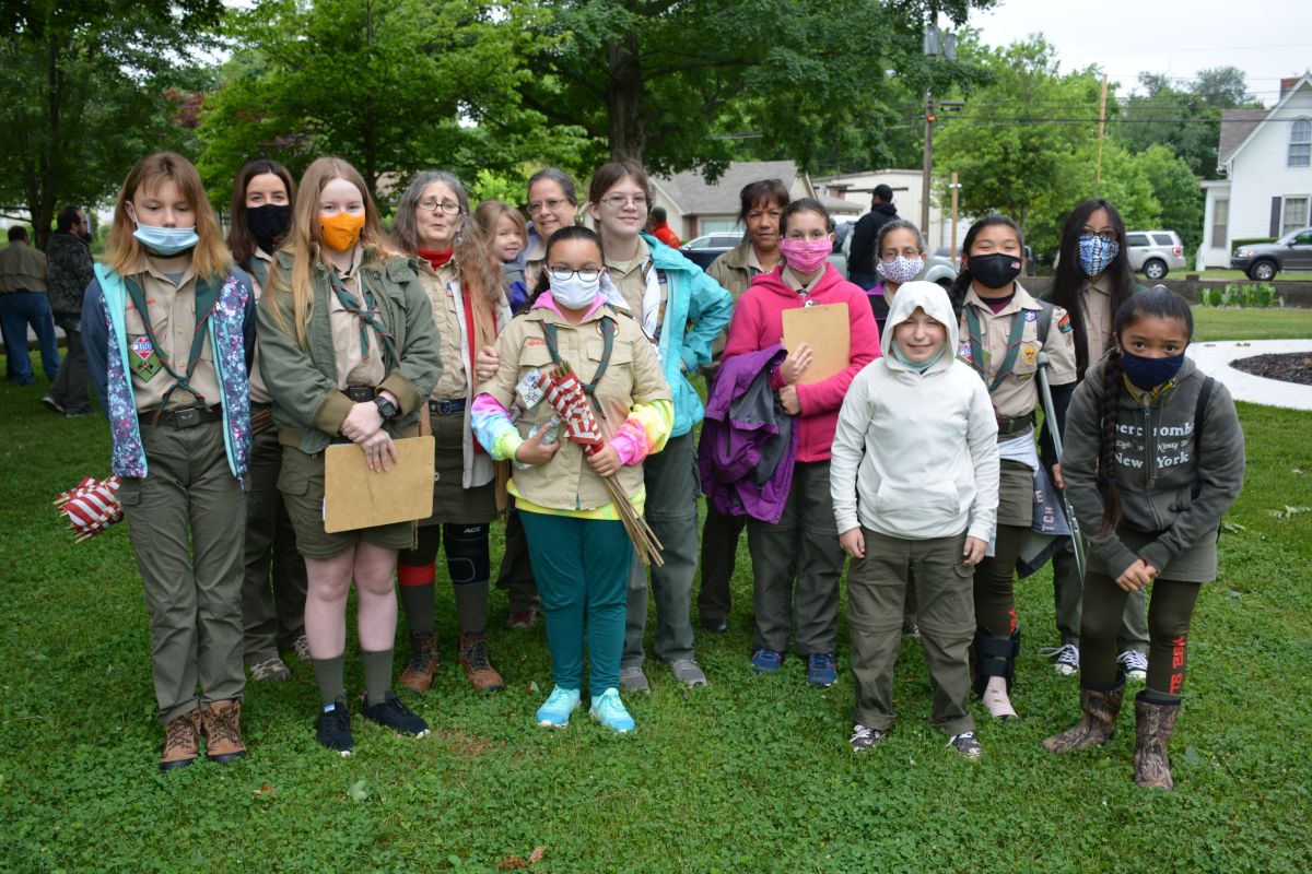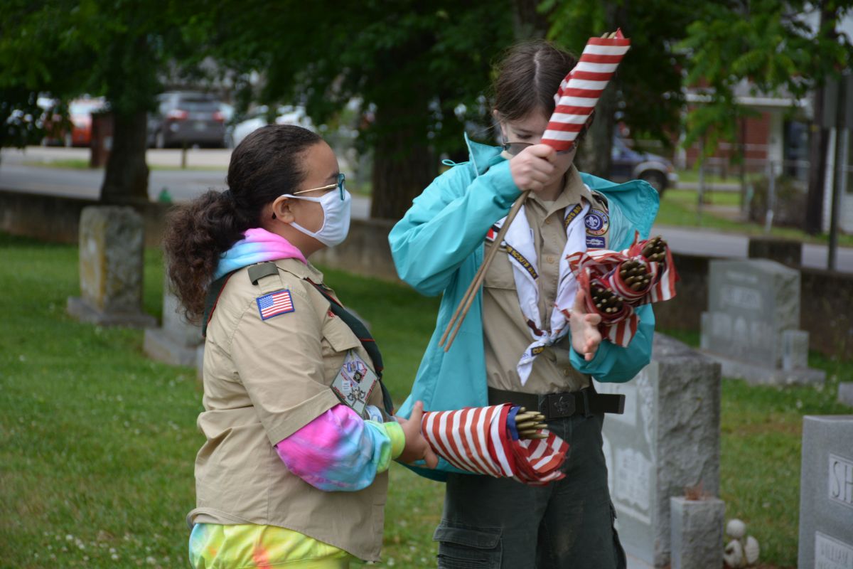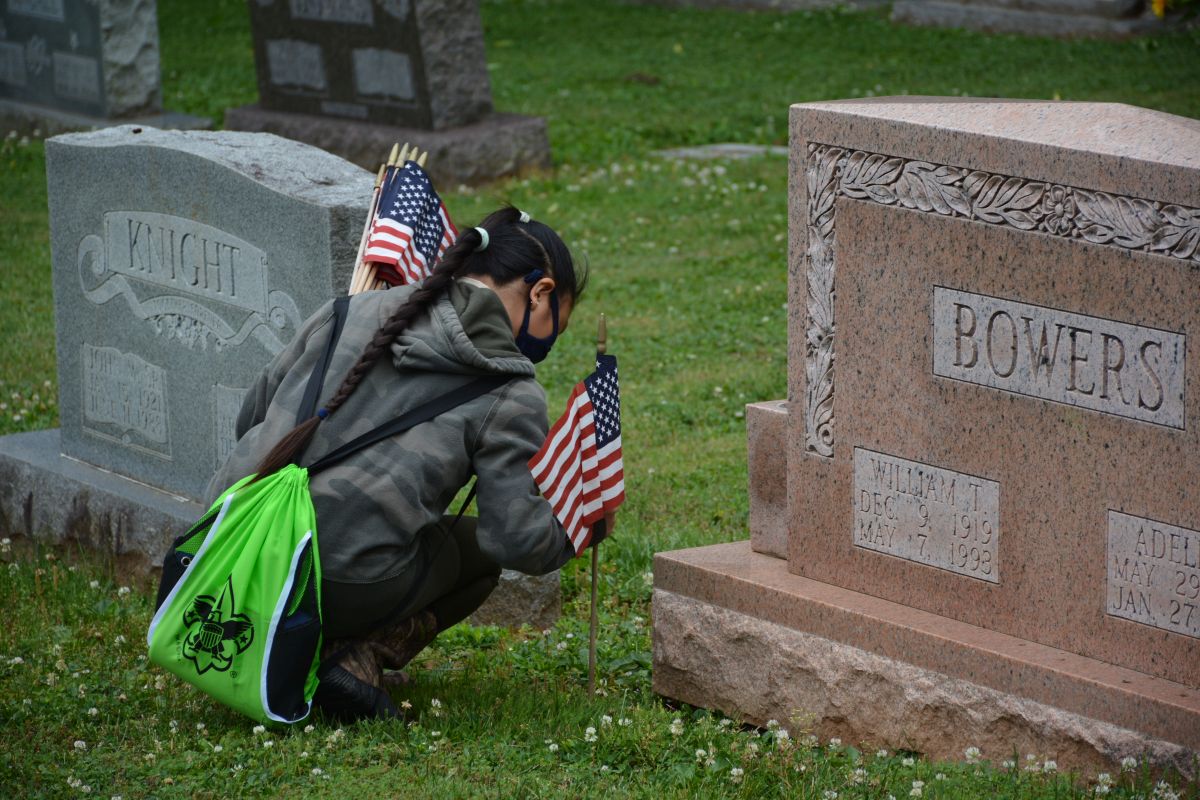More than 100 Boy Scouts, Girl Scouts and Scouts BSA were joined by volunteers as the scouts placed American flags on the gravesites of fallen veterans at Greenwood Cemetery for Memorial Day on Saturday, May 29 2021. (Lee Erwin)