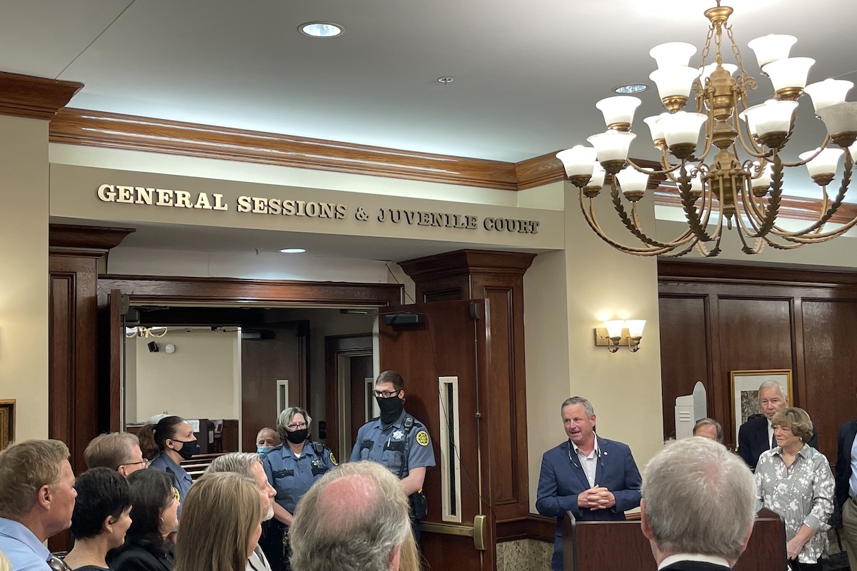 Durrett then read a joint proclamation from the Tennessee House of Representatives by Johnson, Rep. Jay Reedy, Rep. Jason Hodges and Sen. Bill Powers. The resolution recognized Grimes’ 22 years on the General Sessions bench, his military service in the Coast Guard and his establishment of the Montgomery County Drug Recovery Court in 2005.