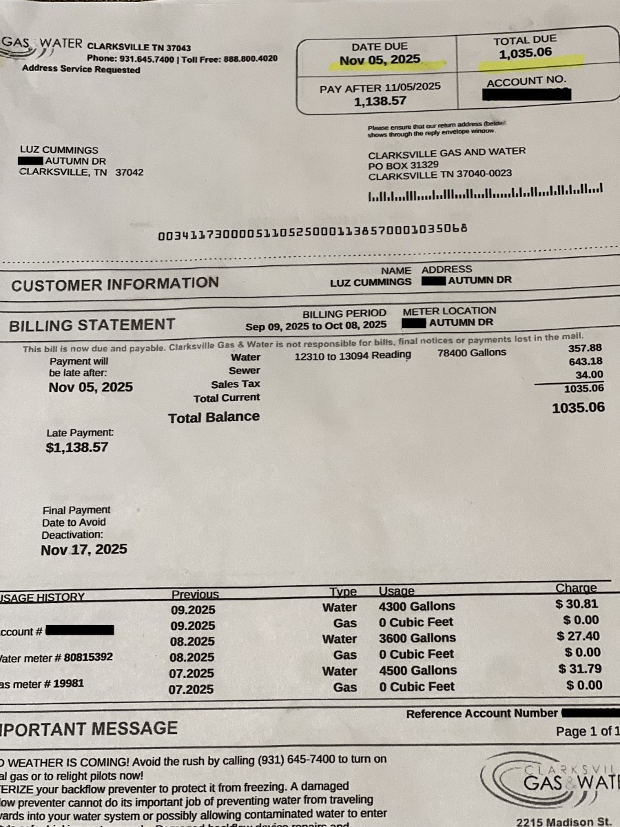 Cummings told Clarksville Now his family is still stuck either paying for their water or their house this week. While they hope to work something out, they were told their bill for next month is high as well.