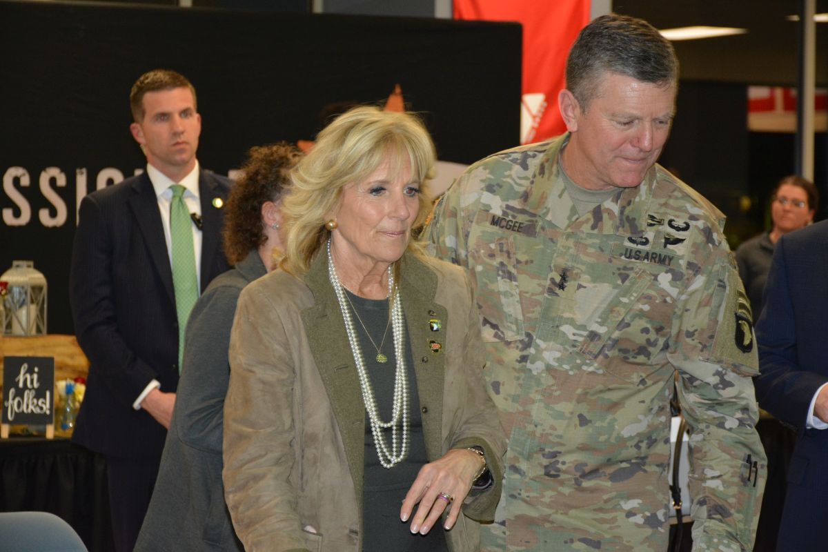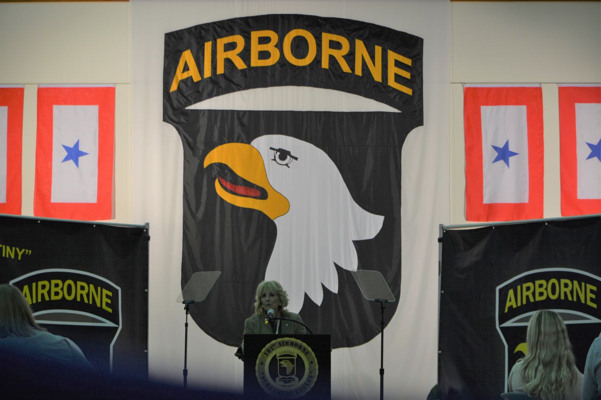 FORT CAMPBELL, KY (CLARKSVILLE NOW) – First Lady Jill Biden visited Fort Campbell Wednesday to speak with the families of soldiers deployed to Europe in support of NATO during Russia’s invasion of Ukraine.