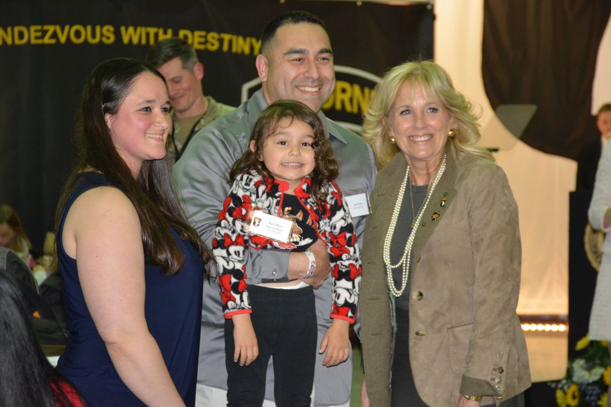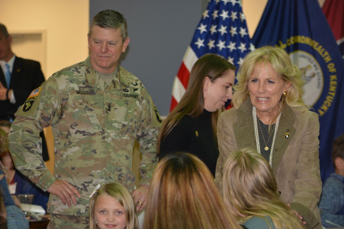 Major General JP McGee and First Lady Dr. Jill Biden meet with military families during her visit to Fort Campbell, on Mar. 9 2022. (Lee Erwin).