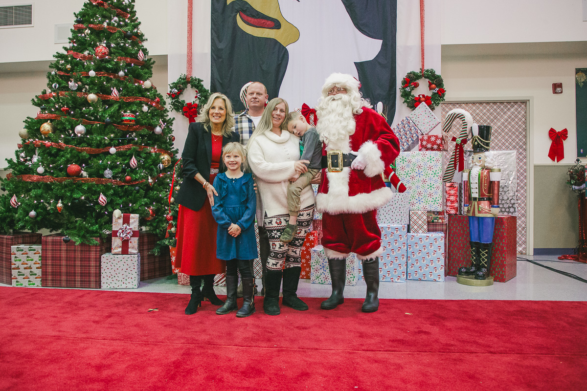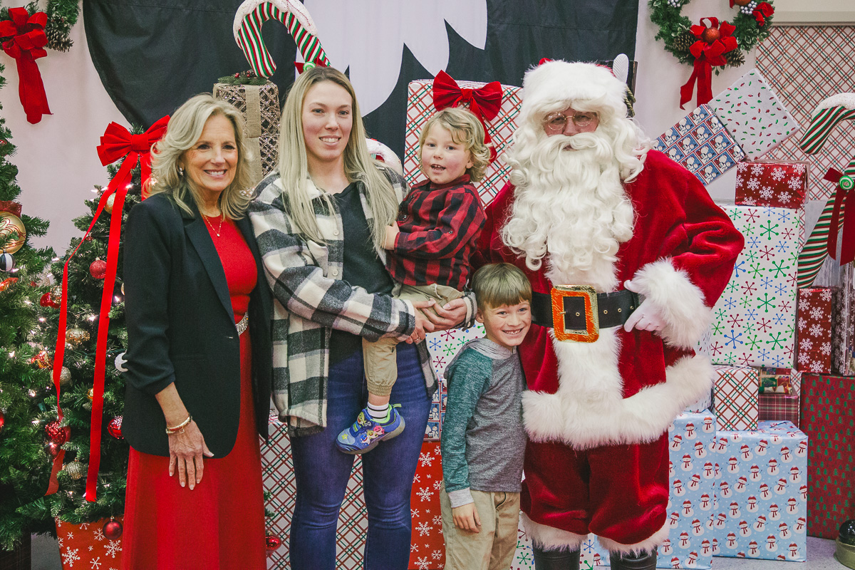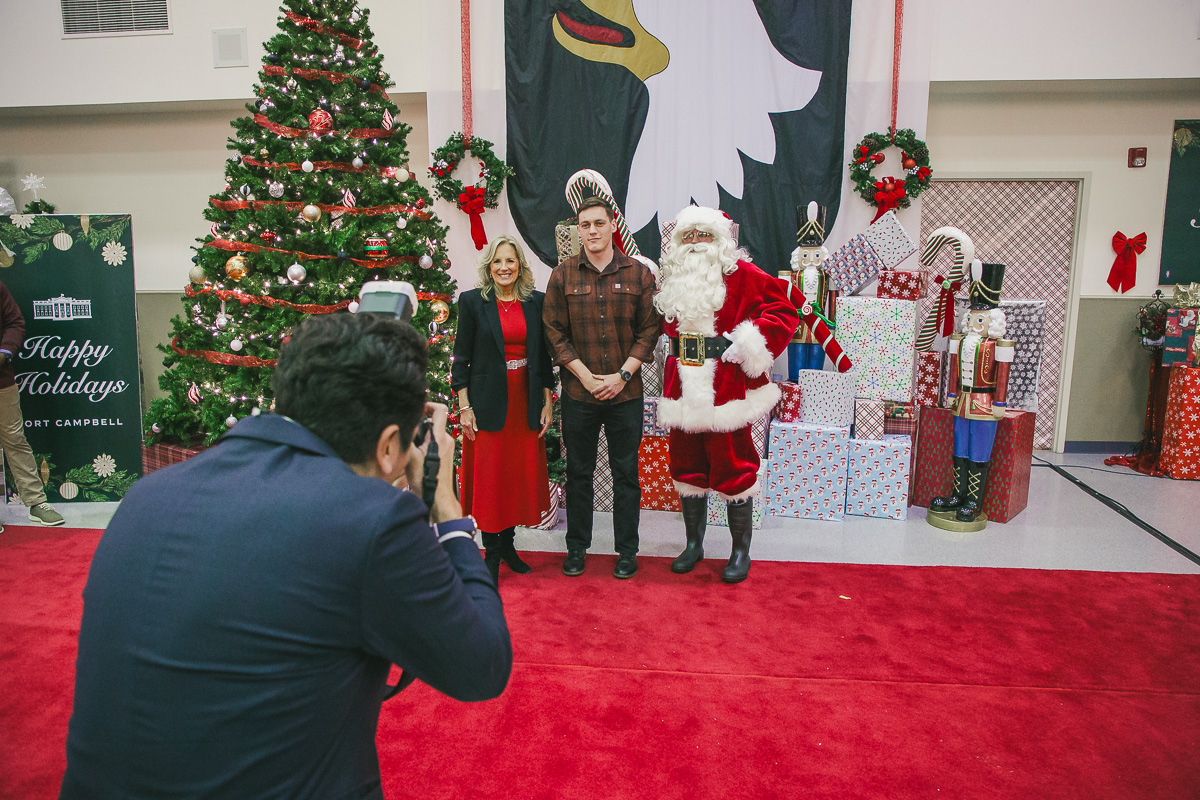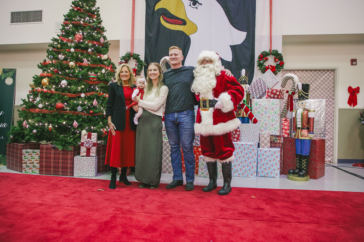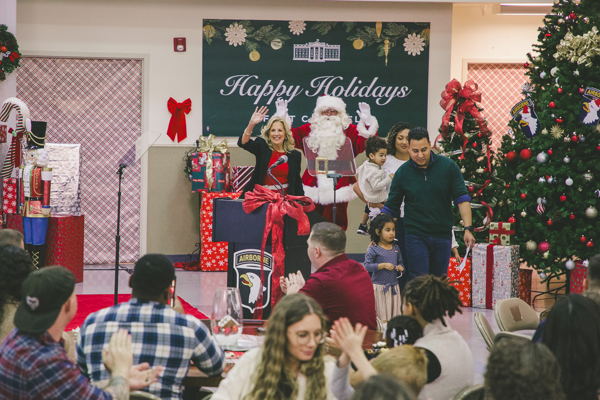 FORT CAMPBELL, KY (CLARKSVILLE NOW) – First Lady Jill Biden and Santa Claus visited Fort Campbell on Saturday via the “Sleigh Force One”, to celebrate Christmas and to meet with military families whose homes were destroyed or damaged by the Dec. 9 tornado.