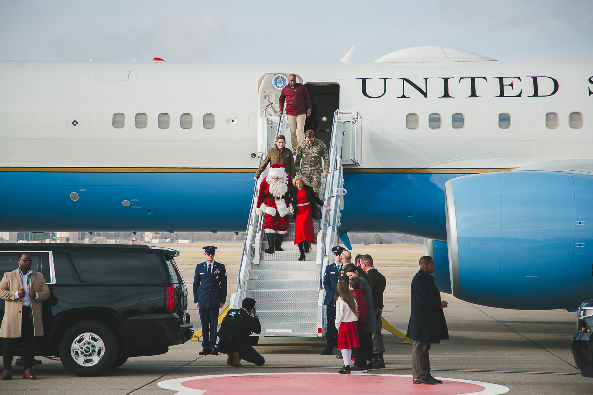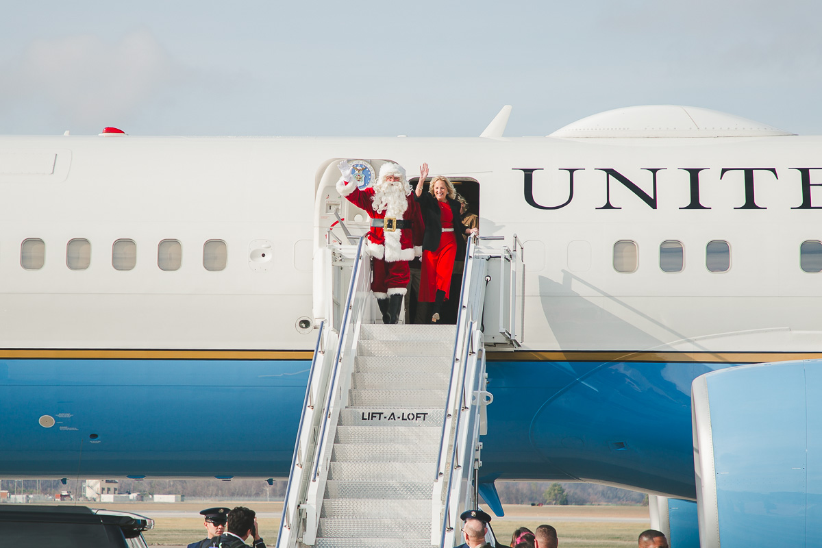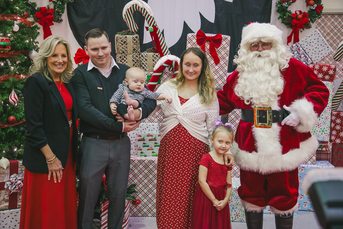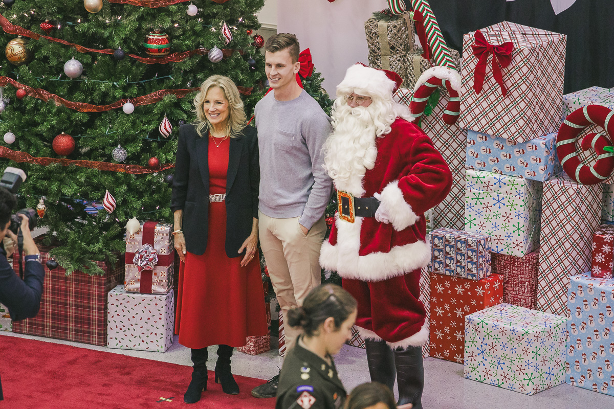 FORT CAMPBELL, KY (CLARKSVILLE NOW) – First Lady Jill Biden and Santa Claus visited Fort Campbell on Saturday via the “Sleigh Force One”, to celebrate Christmas and to meet with military families whose homes were destroyed or damaged by the Dec. 9 tornado.