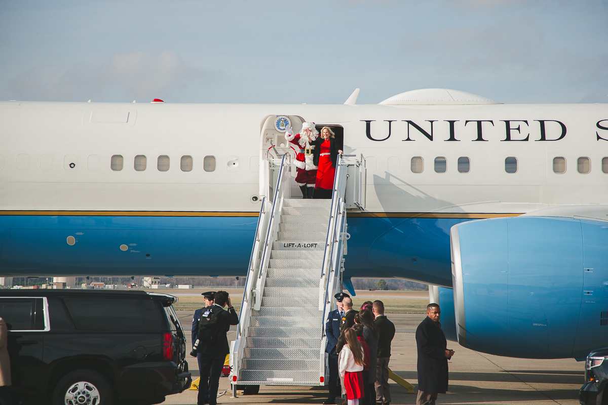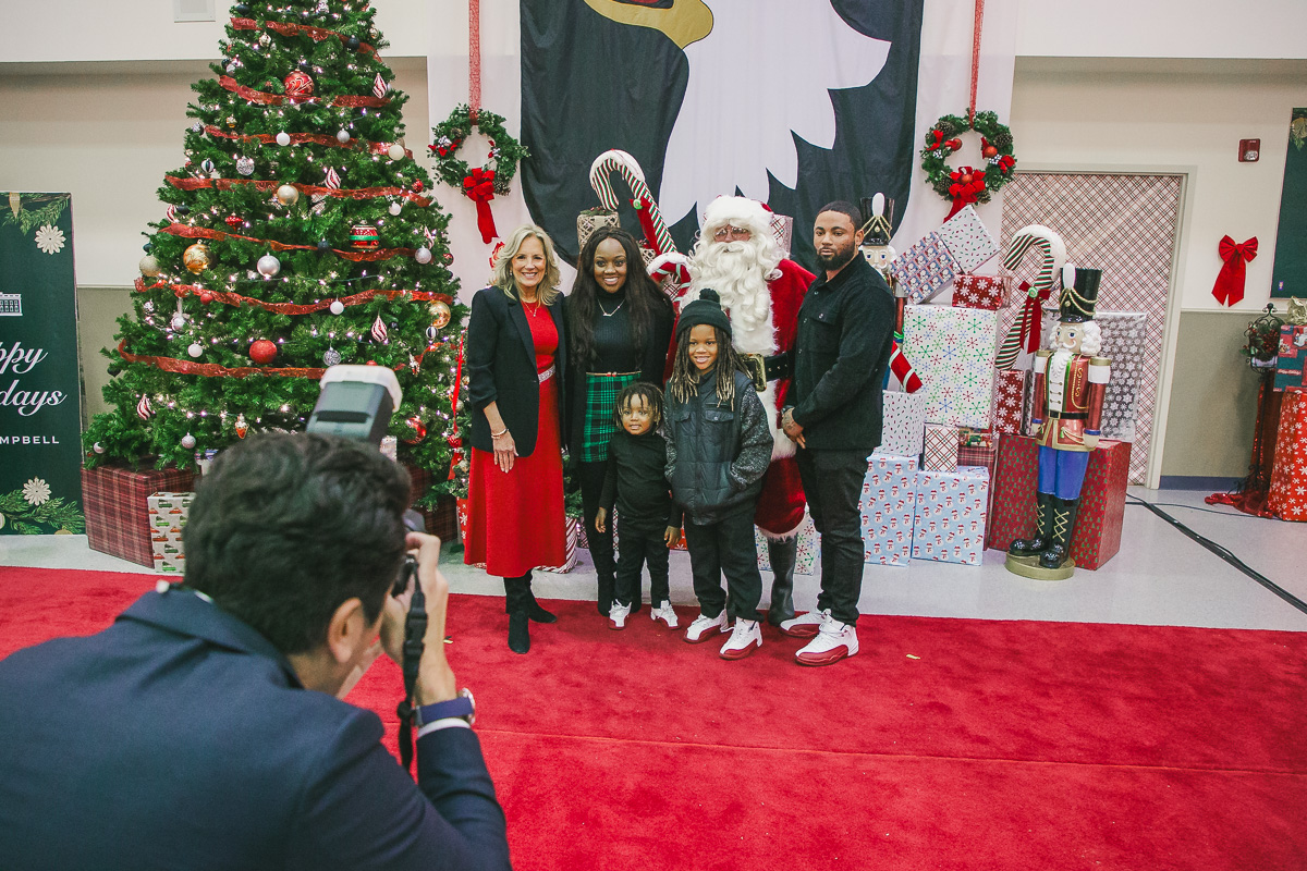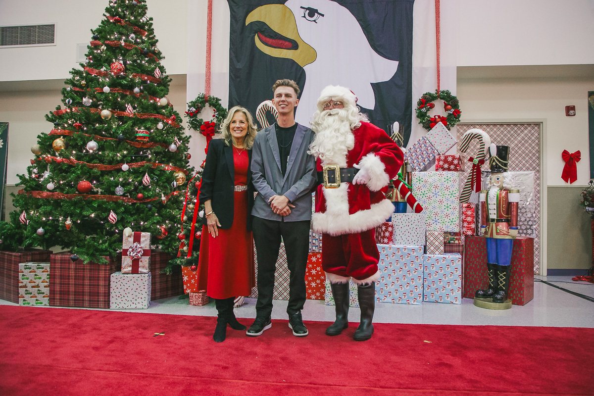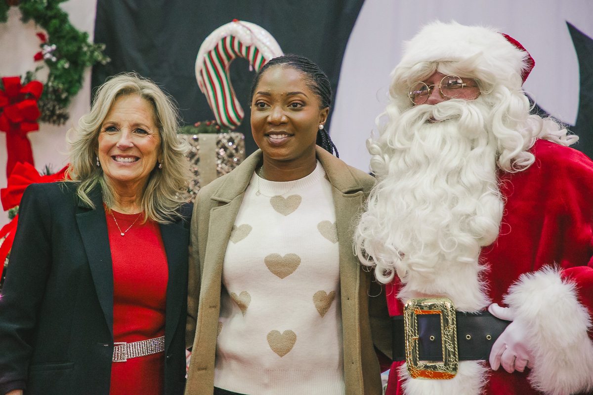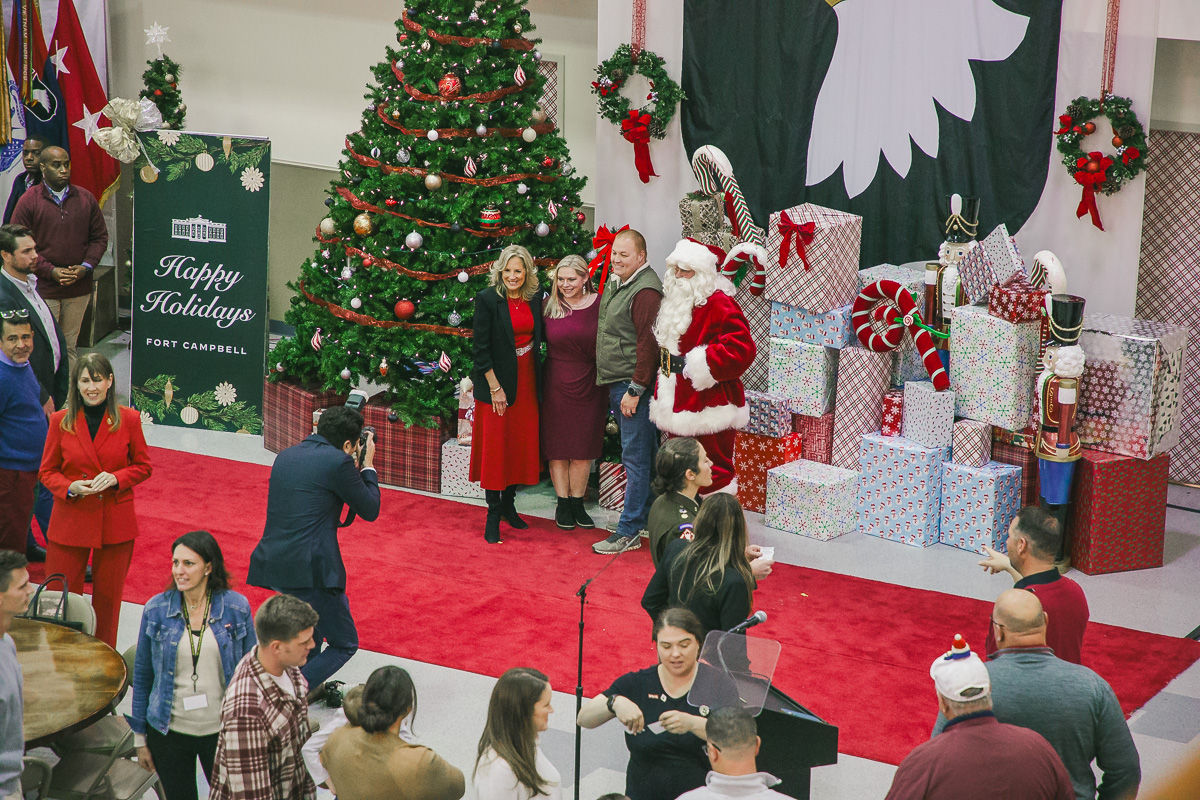 FORT CAMPBELL, KY (CLARKSVILLE NOW) – First Lady Jill Biden and Santa Claus visited Fort Campbell on Saturday via the “Sleigh Force One”, to celebrate Christmas and to meet with military families whose homes were destroyed or damaged by the Dec. 9 tornado.