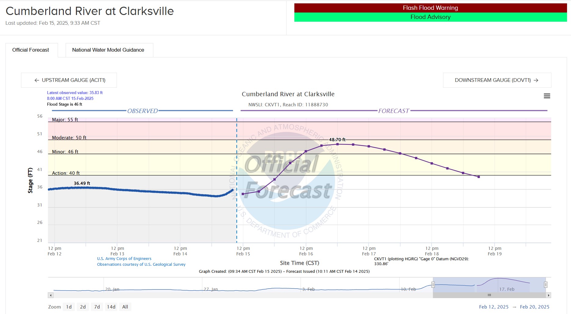Update, 2:59 p.m.: The National Weather Service has issued a Flood Warning for Cumberland River at Clarksville from 10 p.m. today to around 8:50 p.m. on Feb. 18. Moderate flooding is forecasted for the Cumberland River at Clarksville, Ashland City, Dover, as well as Nashville.