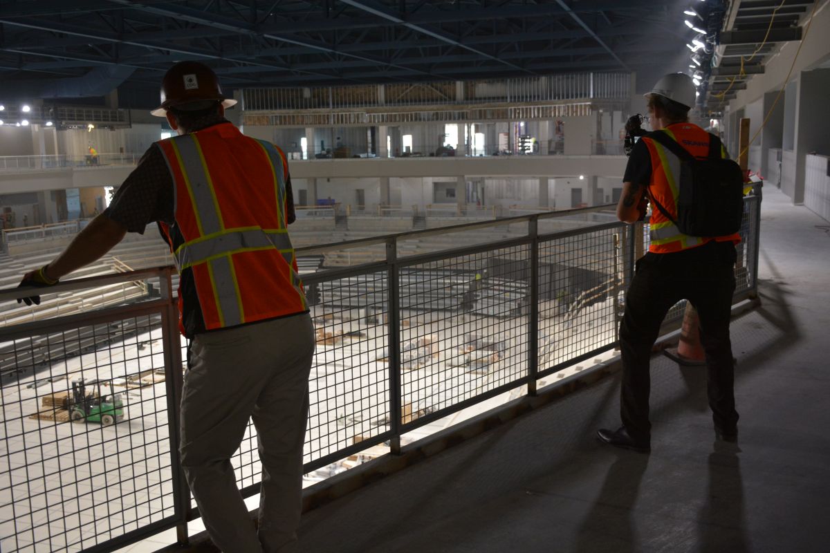 Jordan Wyman and Jim Key look over the arena floor under construction at the F&M Bank Arena on, Aug 8, 2022. (Lee Erwin)