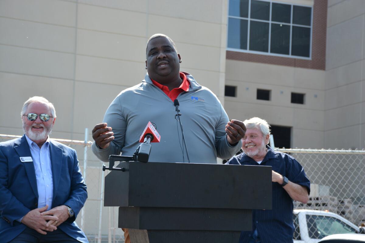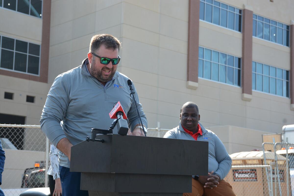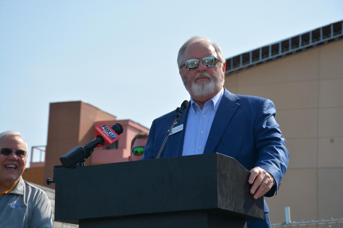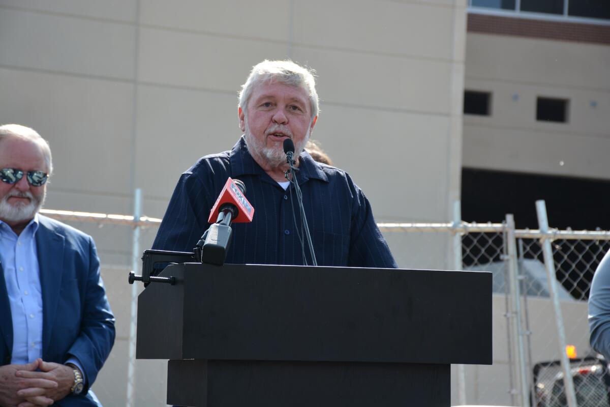 F&M Bank President Sammy Stuard spoke with guests outside of the new arena downtown May 13, 2022 (Casey Williams)