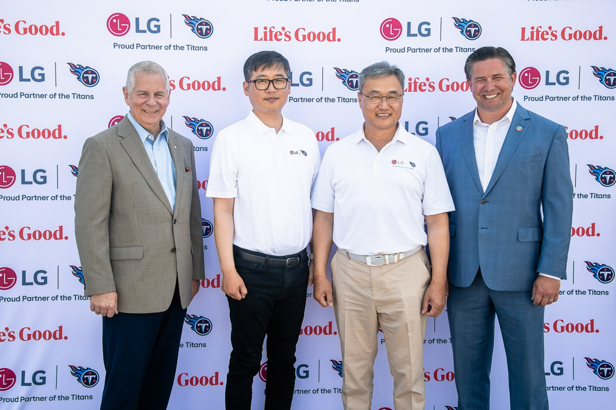 Joe Pitts, Chang Woo Son, Chris Jung & Wes Golden at the Tennessee Titans and LG gathering to expand community programs on July 8, 2024. (Wesley Irvin)