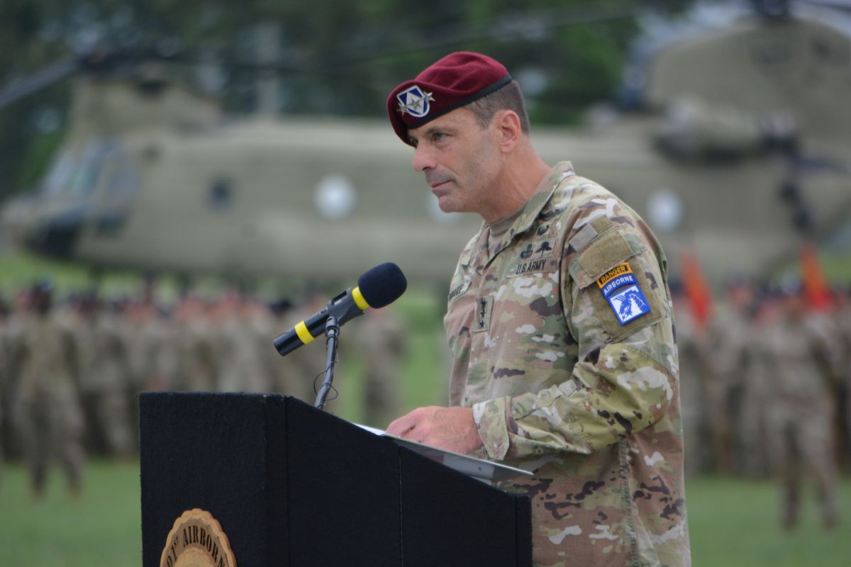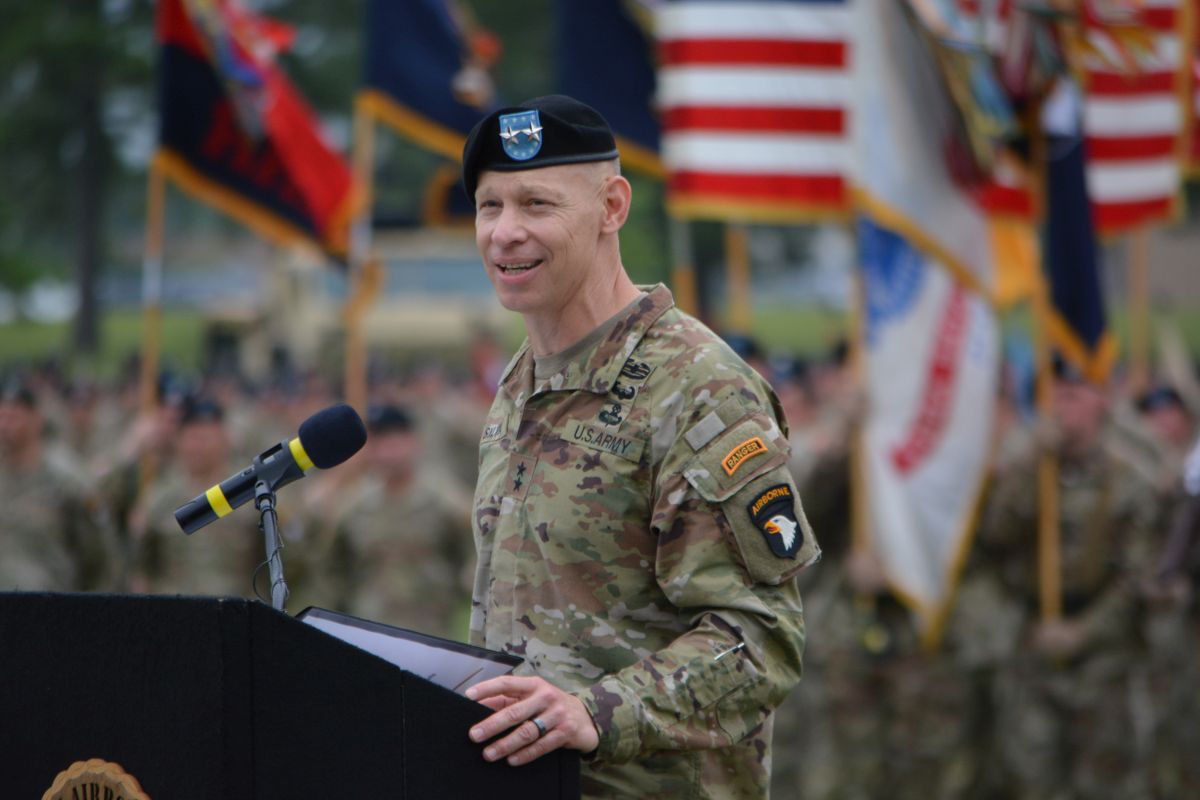 Lieutenant General Christopher Donahue speaking at the 101st Airborne Division (Air Assault) and Fort Campbell Change of Command Ceremony on Jul. 20, 2023. (Lee Erwin)