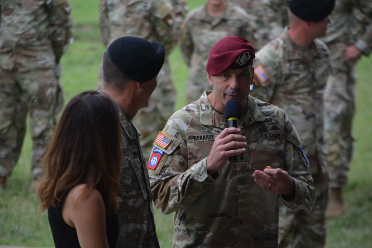 Lieutenant General Christopher Donahue speaks to Major General JP McGee and Kate McGee at the 101st Airborne Division (Air Assault) and Fort Campbell change of Command on Jul. 20, 2023. (Lee Erwin)