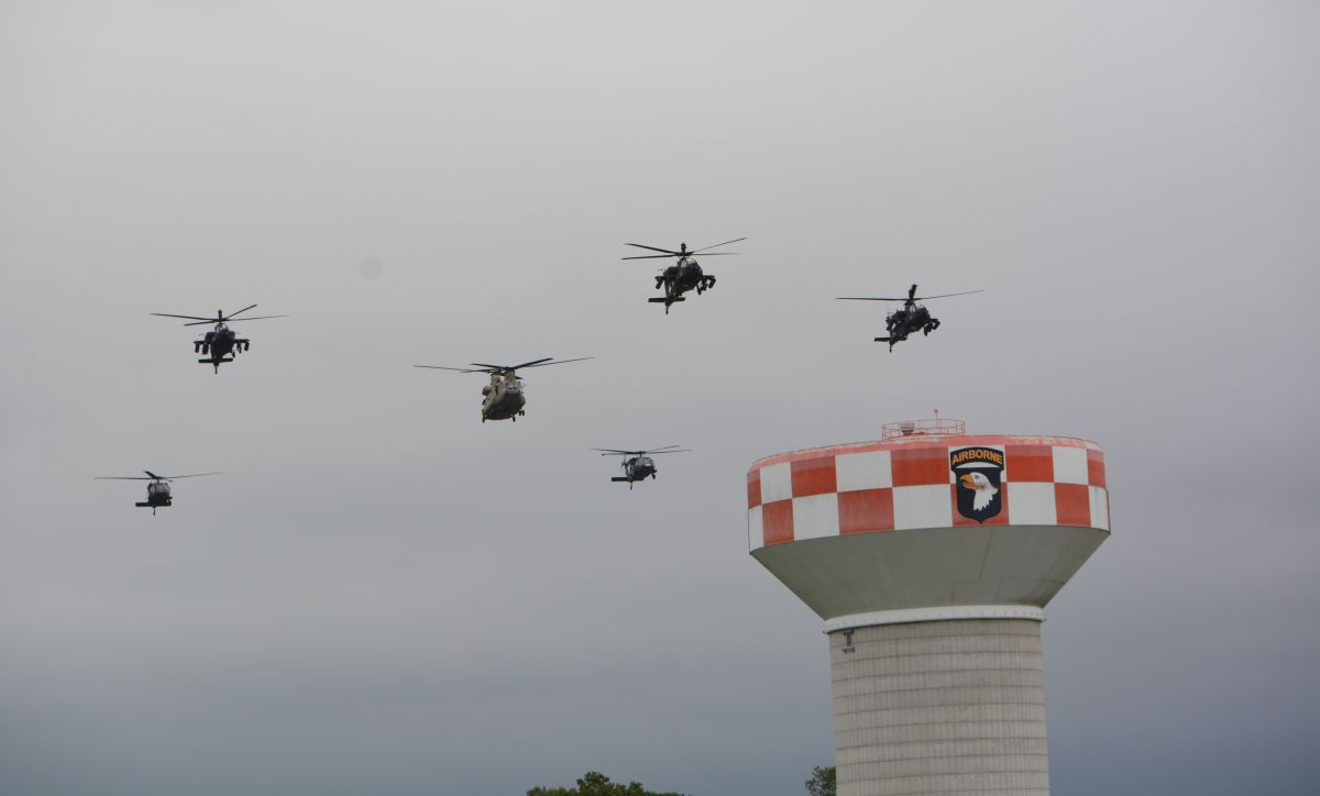 A fly over of 101st helicopters at the 101st Airborne Division (Air Assault) and Fort Campbell Change of Command Ceremony on Jul. 20, 2023. (Lee Erwin)