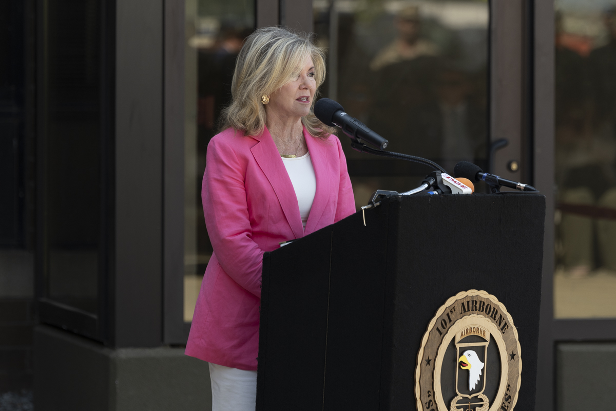US. Senator Marsha Blackburn speaking at the 1st BCT Volar Barracks Ribbon Cutting Ceremony. August 27, 2024 (Jeff Danault)