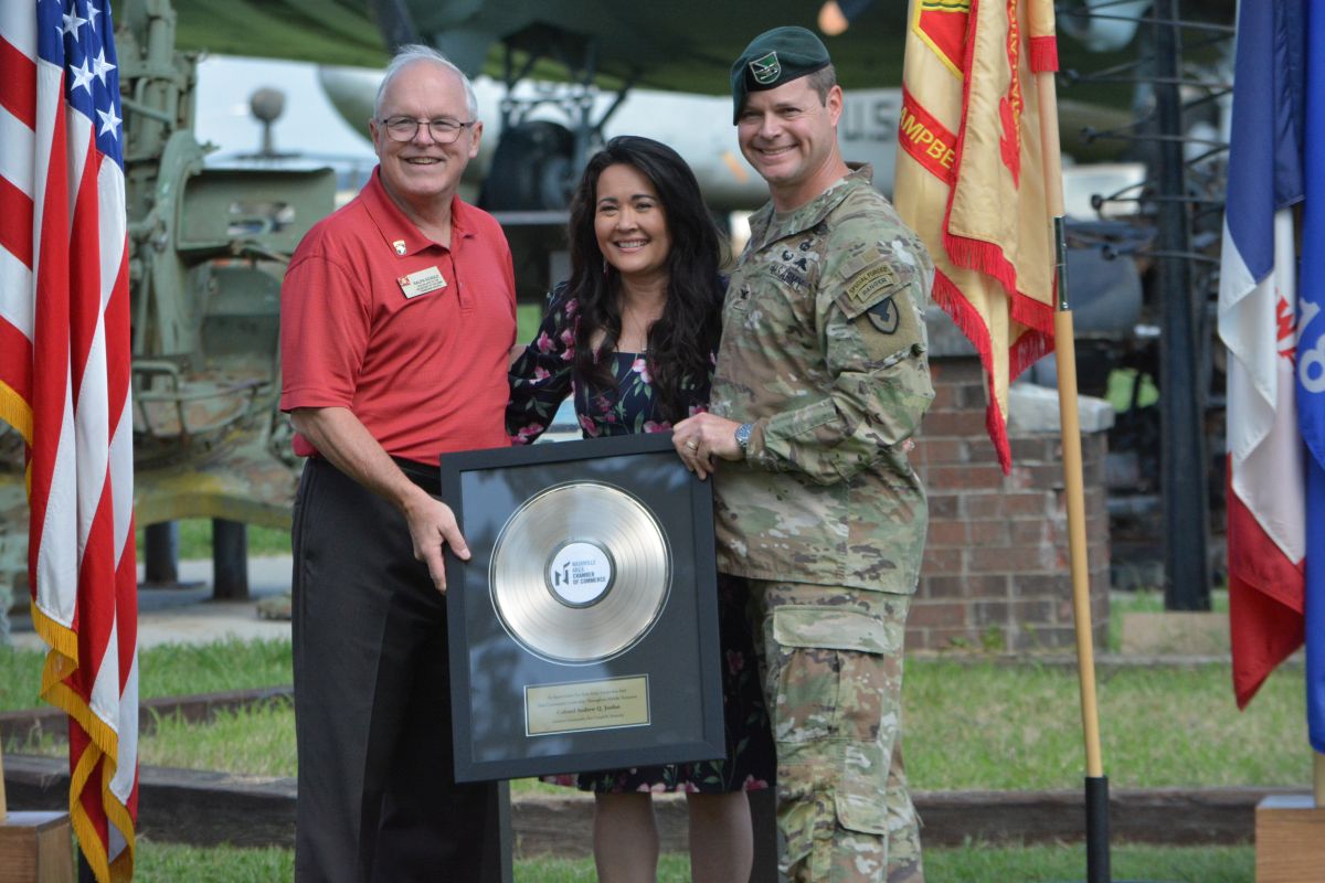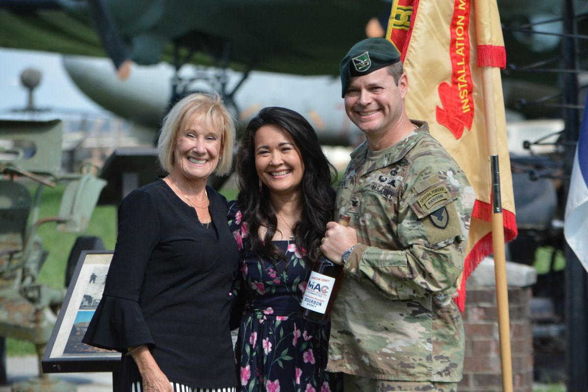 Sam Nienow, Susan Jordan & colonel Andrew Jordan at the U.S. Army Garrison Fort Campbell Change of Command Ceremony on Aug. 16, 2023. (Lee Erwin)