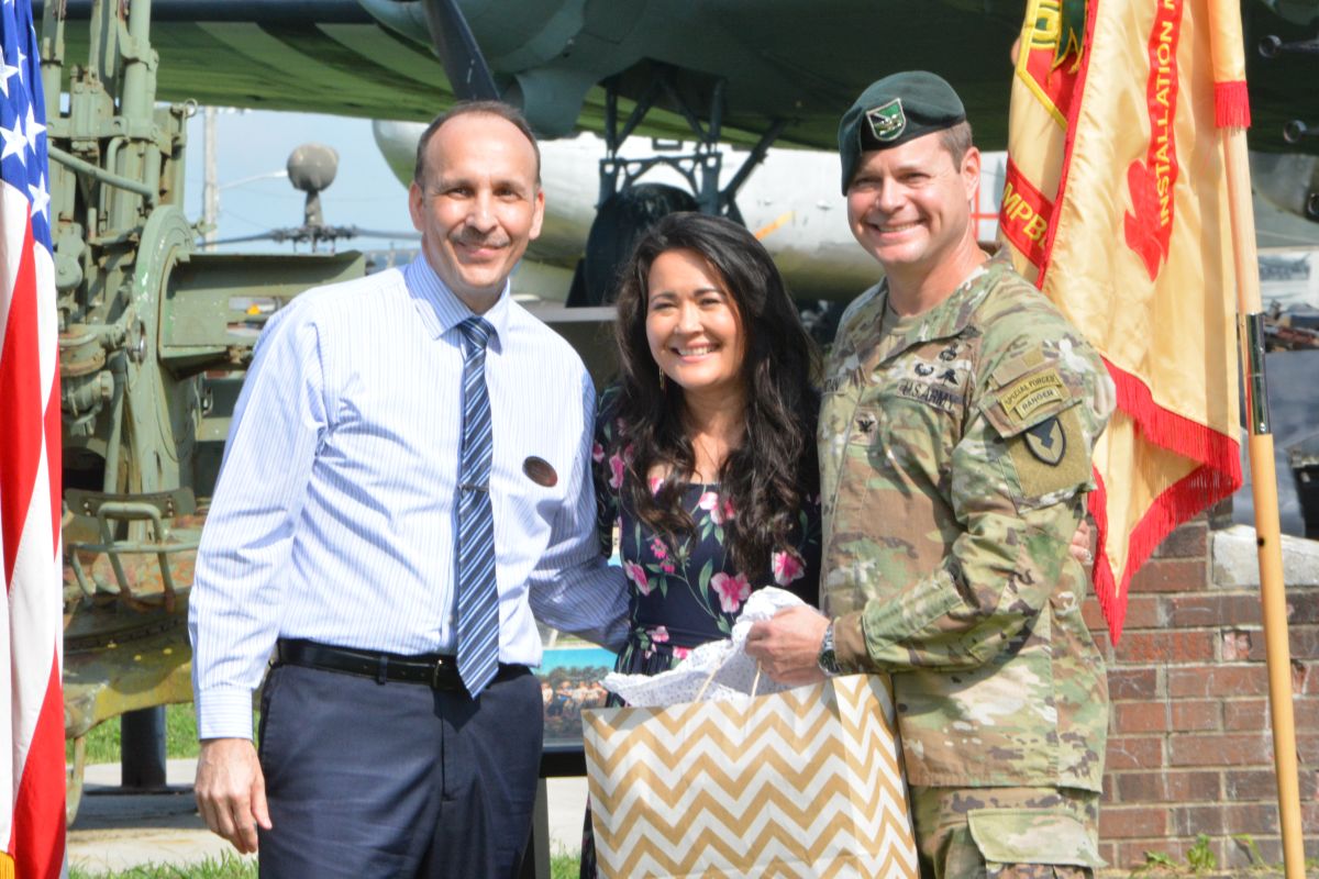 John Clement, Susan Jordan & Colonel Andrew Jordan at the U.S. Army Garrison Fort Campbell Change of Command Ceremony on Aug. 16, 2023. (Lee Erwin)