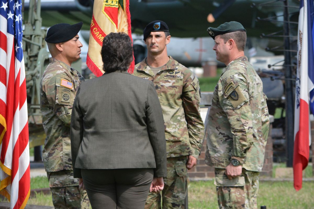 The garrison colors were passed from Jordan to Midberry, symbolizing the outgoing commander passing along the mantle of leadership.