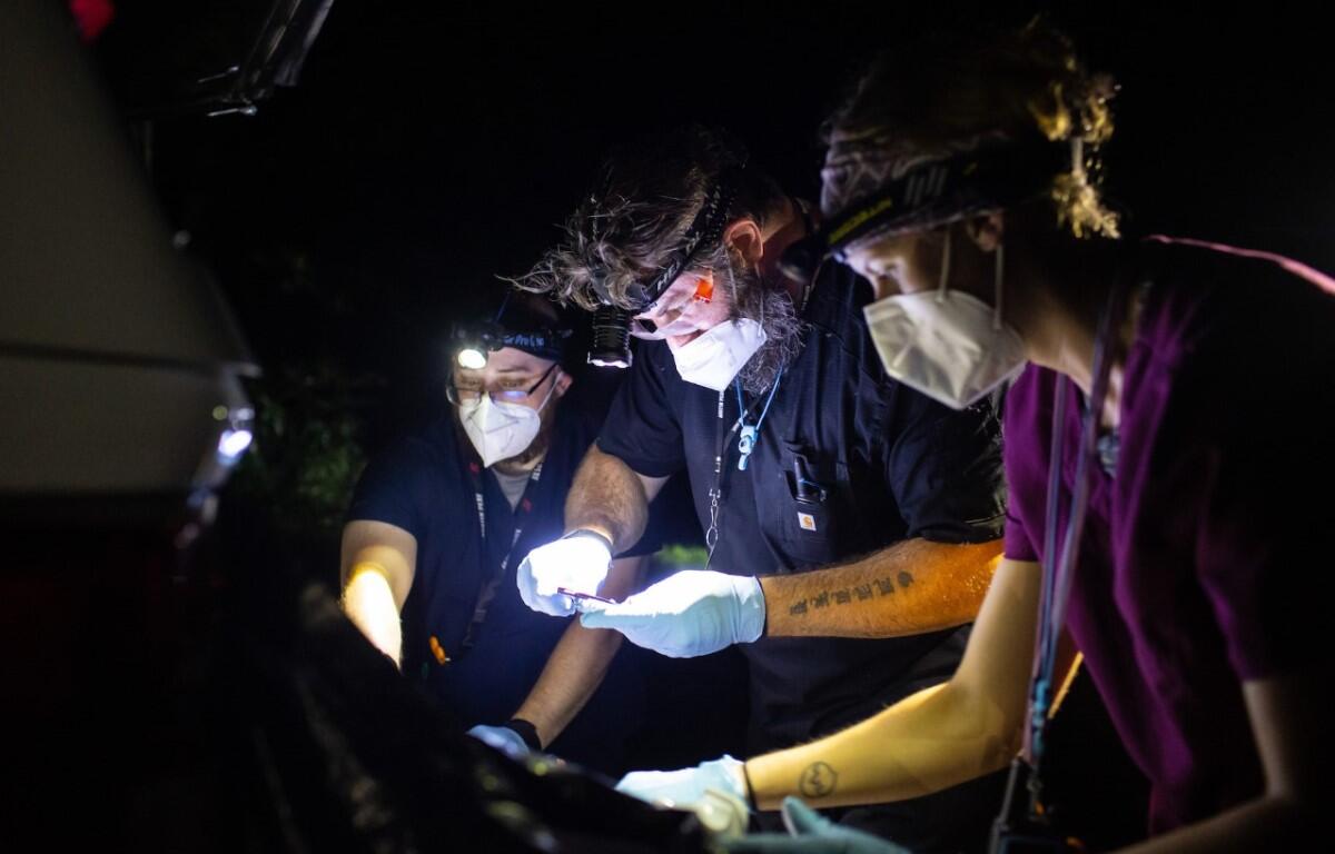 Gulley, Crowley and fellow APSU student Dakota Van Parys retrieved the bats from the nets and brought them to an Austin Peay field research truck for a flurry of scientific activity. They recorded the bats’ species, age, sex and mass.